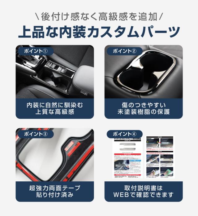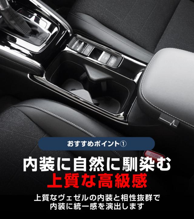 新型ヴェゼル専用設計、フロント・リアのカップホルダーに装着するドレスアップパーツのセットです。大人気だった前期専用のパーツセットに続き、後期モデル専用が新登場!