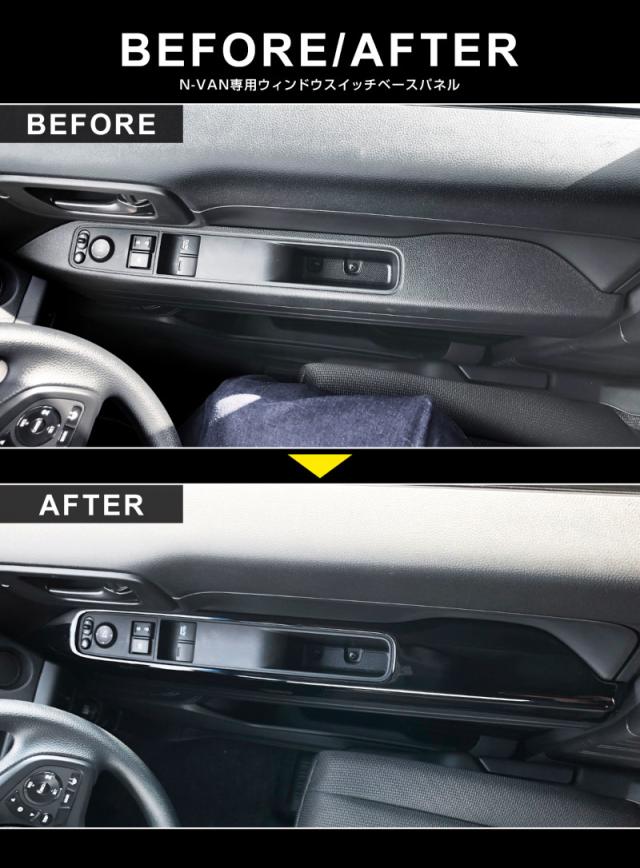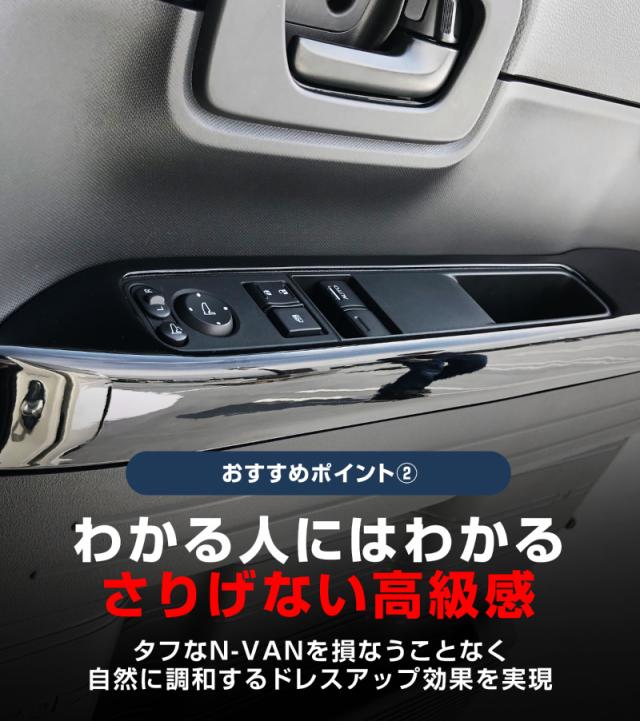 ホンダ N-VAN専用設計の、フロントドアの内側に装着するウィンドウスイッチベースパネル2Pです。