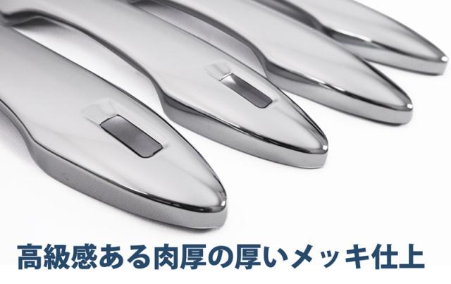 本商品はドアハンドル全体を覆うカバータイプとなり、美しいメッキ仕上げでサイドビューをぐっと引き締めて高級感を演出します。