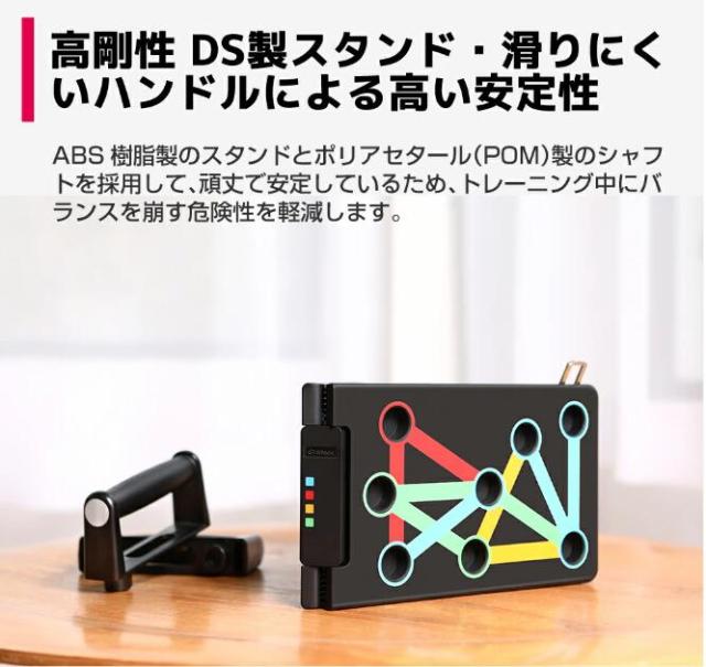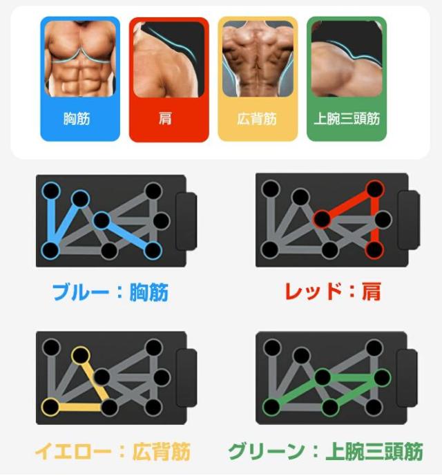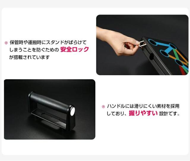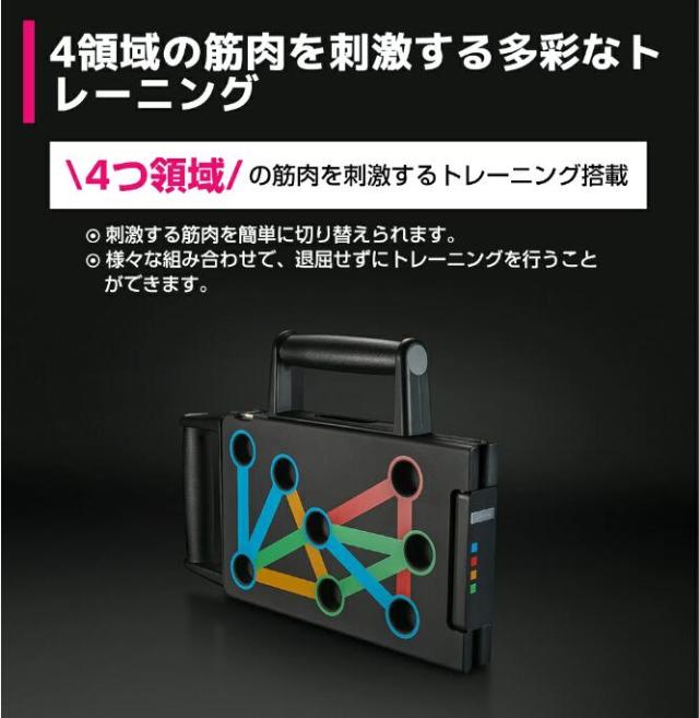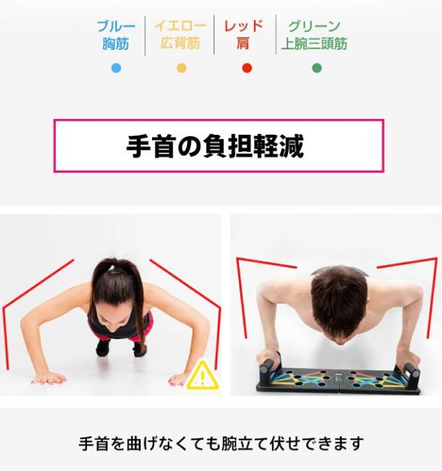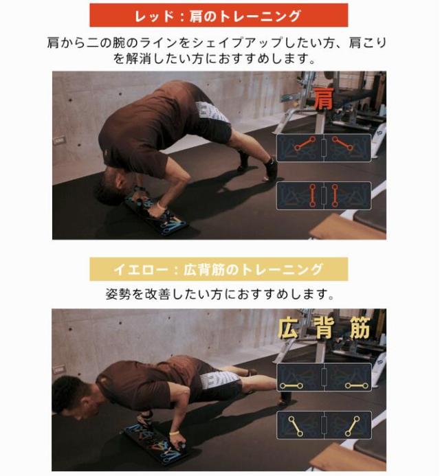 多彩なプッシュアップ姿勢からお好みでトレーニングを選ぶことができ、腕立て伏せの初心者から上級者まで様々な方のニーズに応えます。鍛えたい筋肉によってプッシュアップスタンドの位置を変えて効果的にトレーニングを行えます。