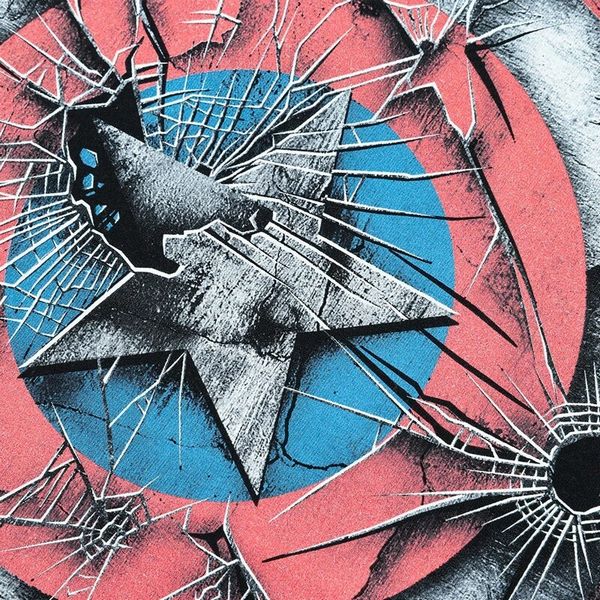 弾丸によって撃ち抜かれてひび割れた星型の盾がクールで渋い「MARVEL(マーベル)」キャプテンアメリカのプリントTシャツです!