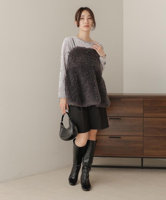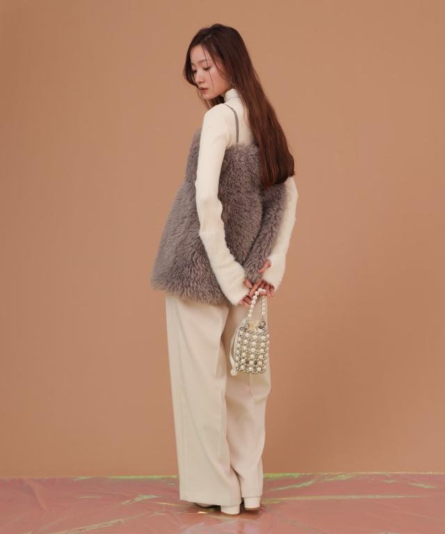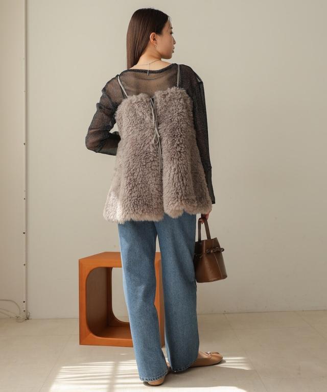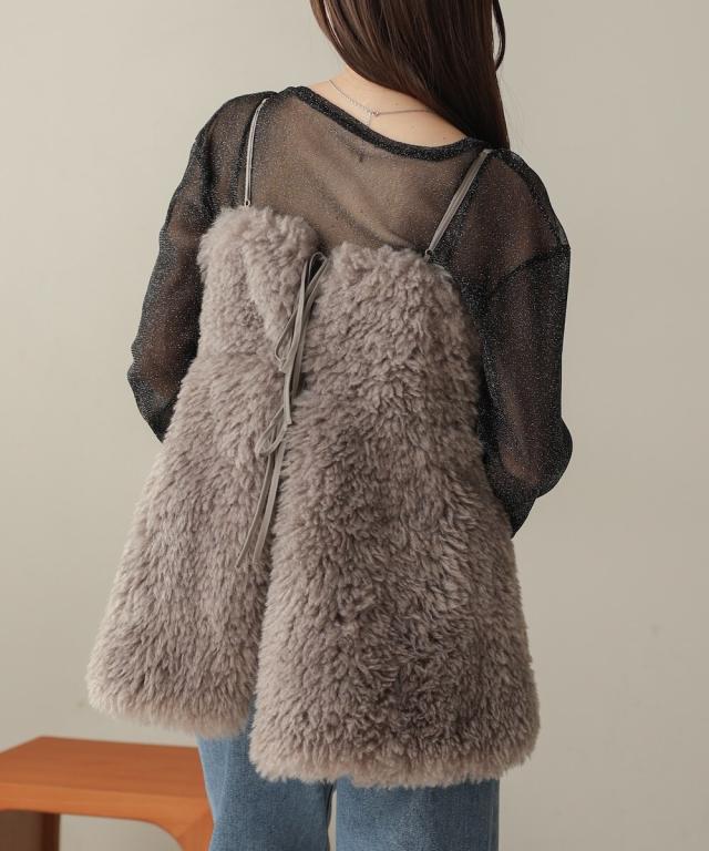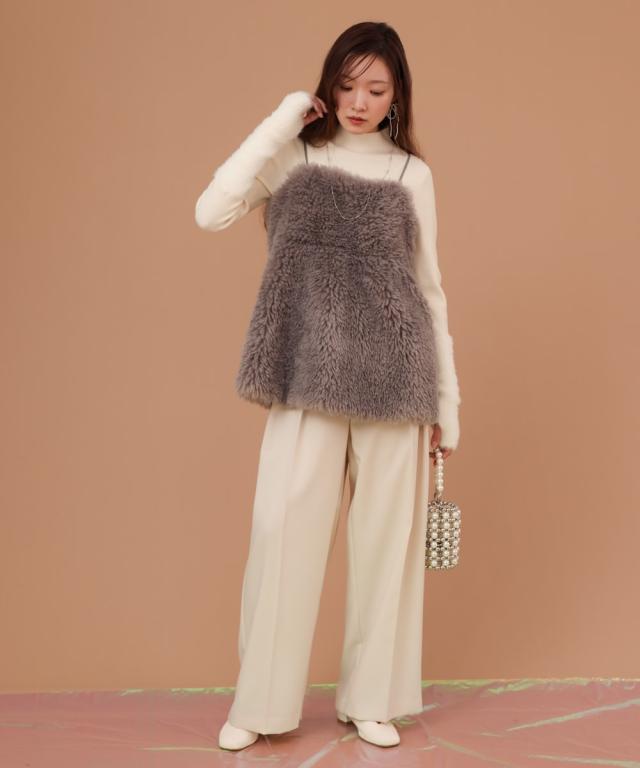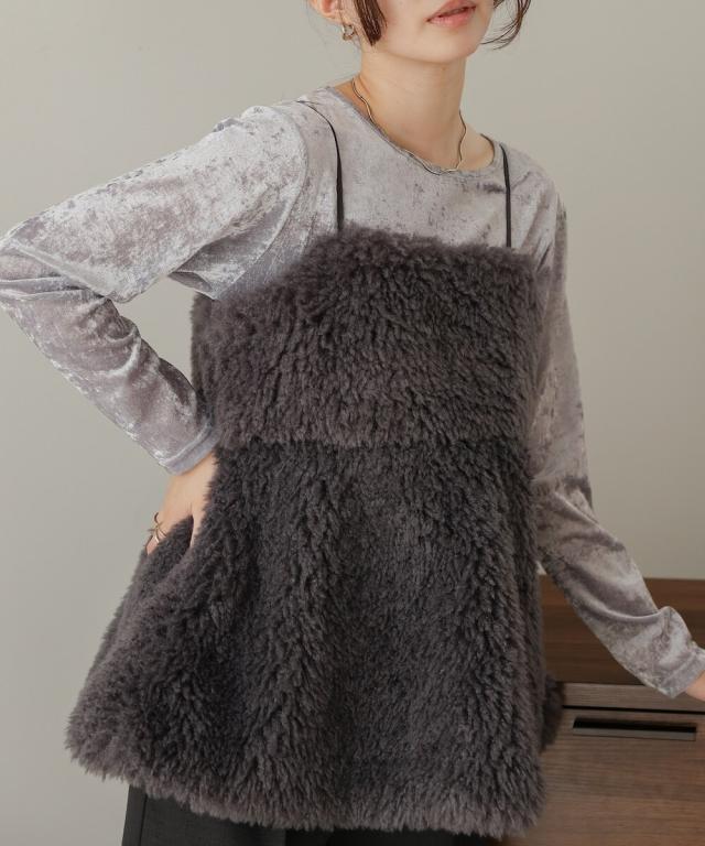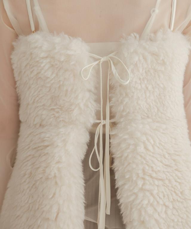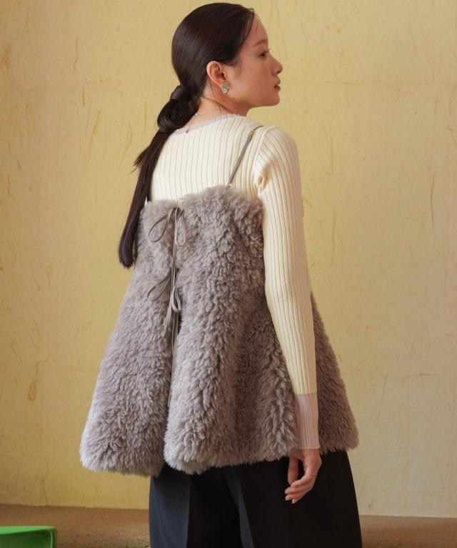 今年らしいふわふわディテールが愛らしい フェイクファーがボリューミーなキャミベストです。バスト下から切り替えたペプラムシルエットが可愛らしく、コーディネート全体をフェミニンに仕上げてくれます。華奢なショルダーストラップには お好みで調整可能な嬉しいアジャスター付き。バックスタイルはリボンを2か所結んで頂く仕様で、360度抜かりなくこだわりを詰めました。