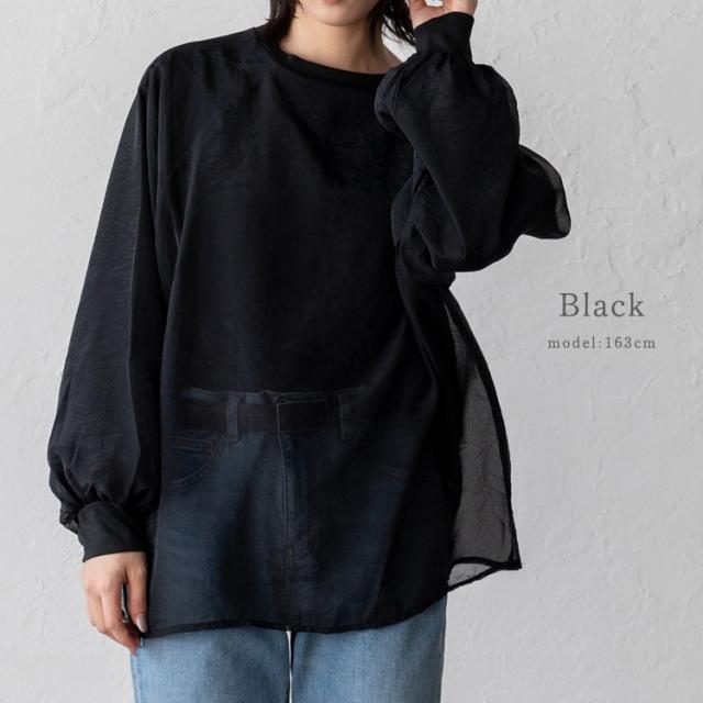 Tシャツに透け感のあるオーガンジー生地を重ねたレイヤードトップス。