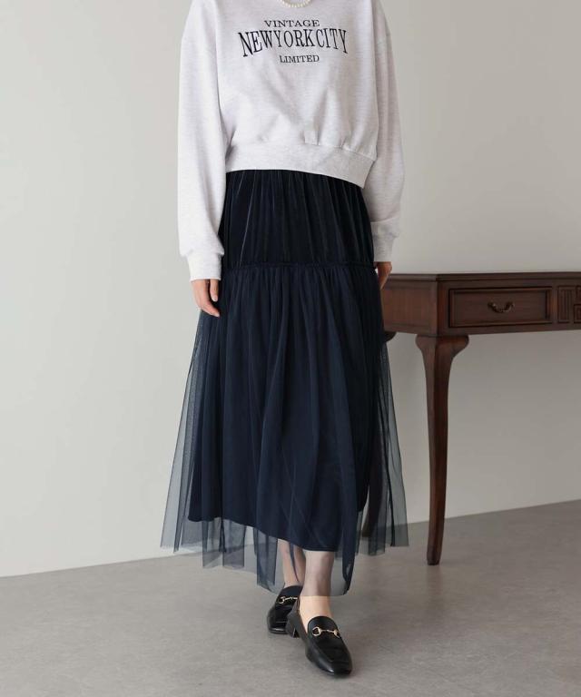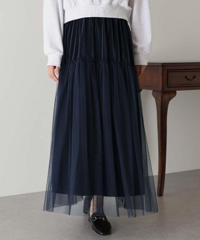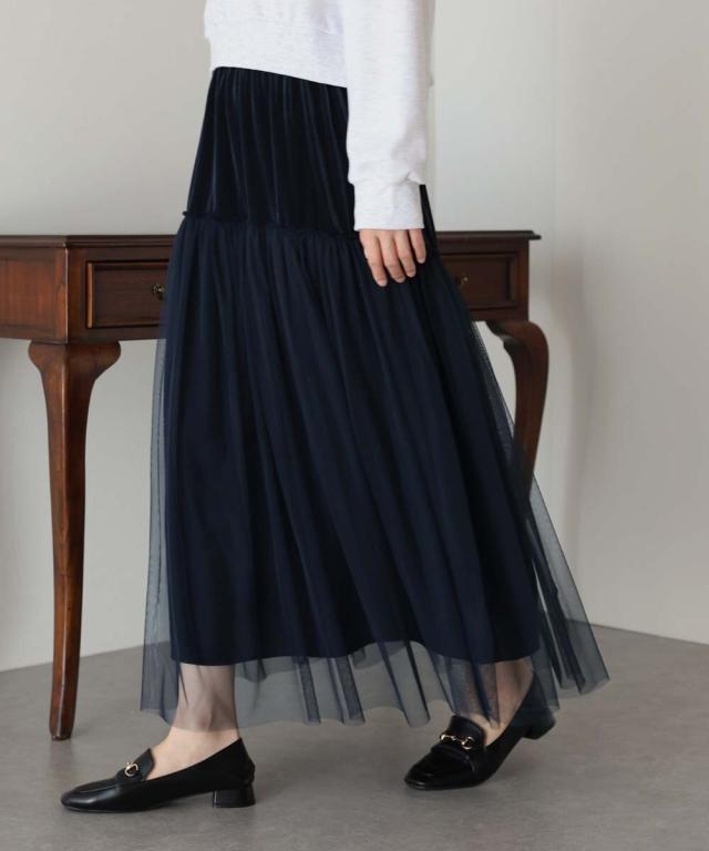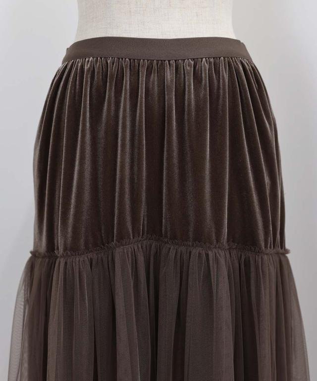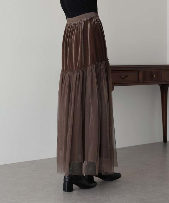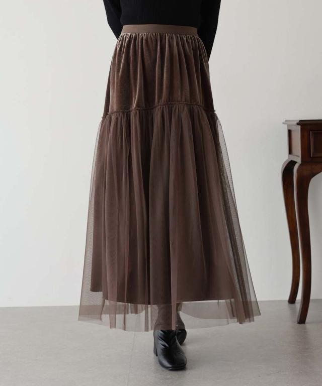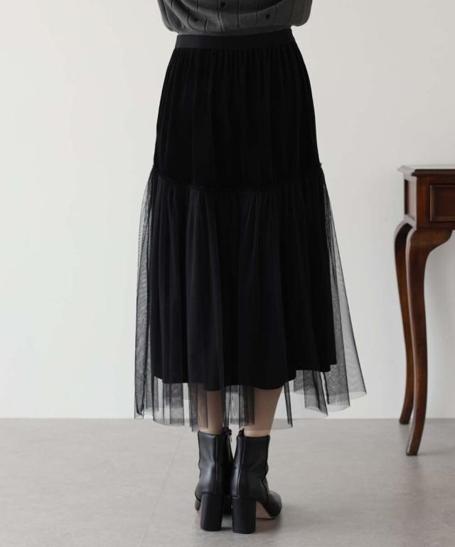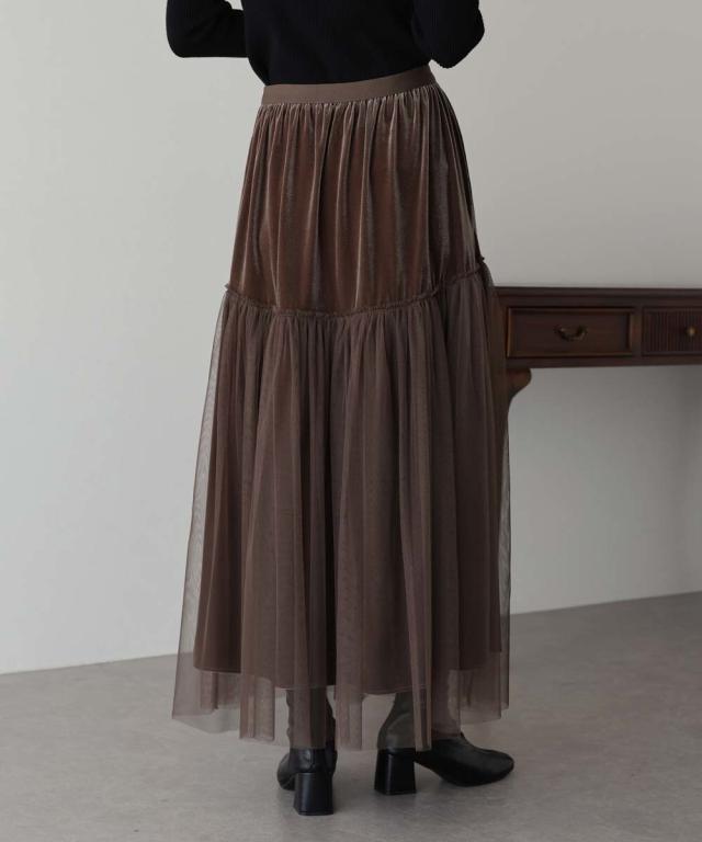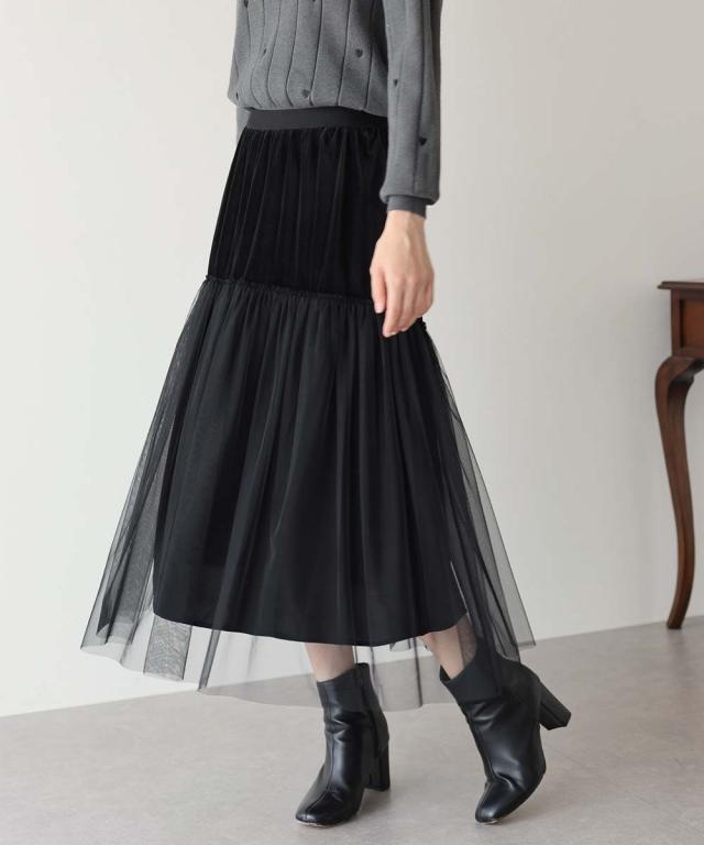 柔らかな光沢とマットな質感が上品なベロア生地にトレンド感のあるチュール素材を重ねたティアードスカート。