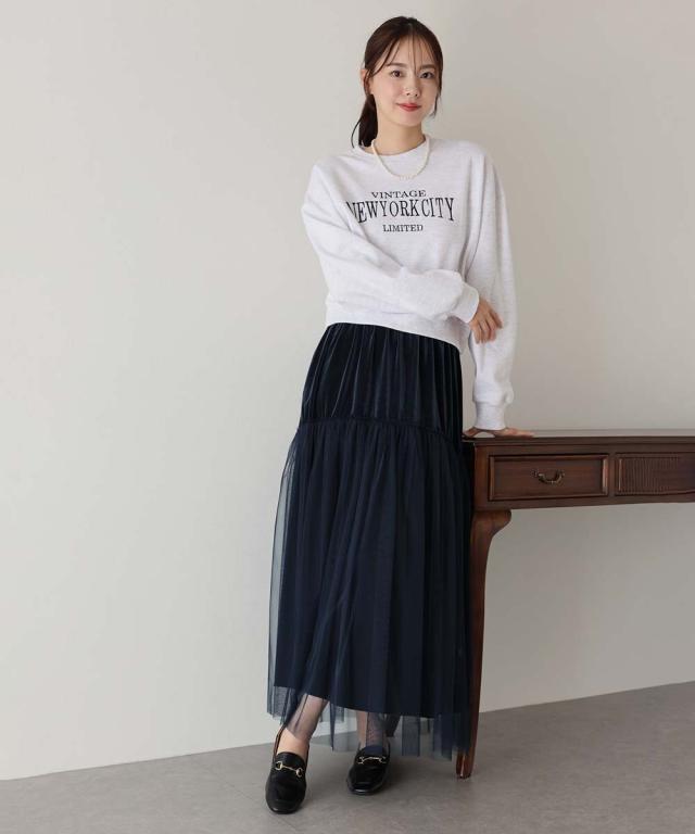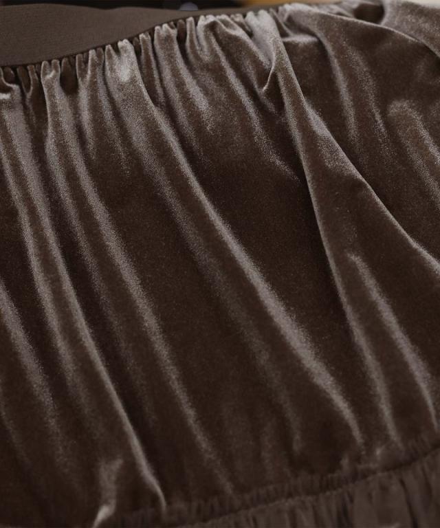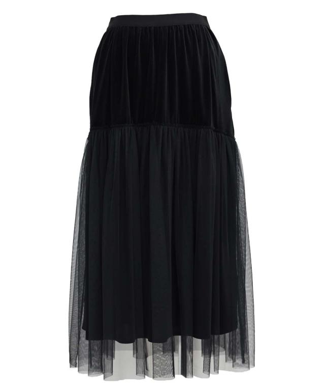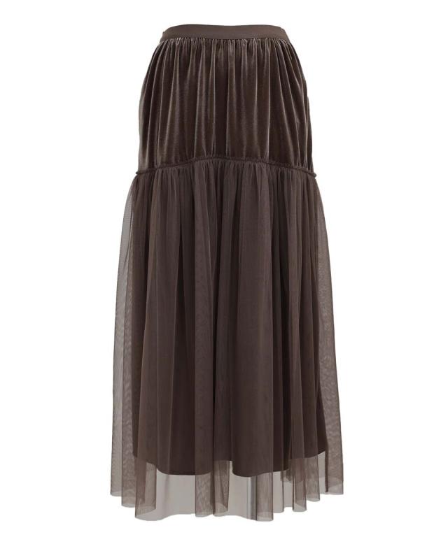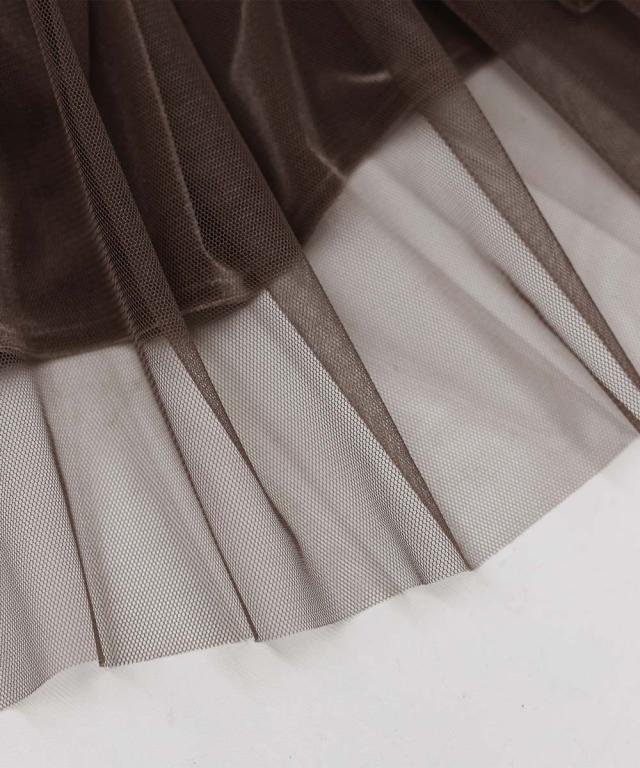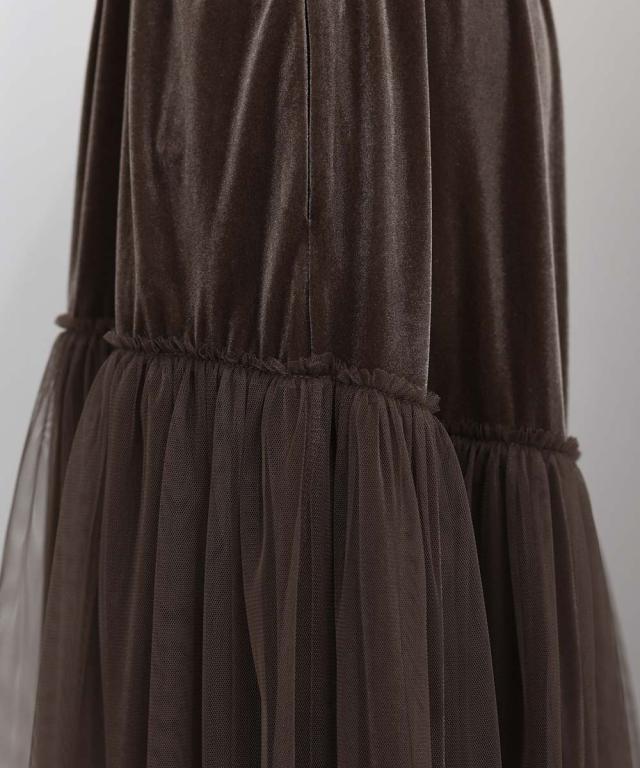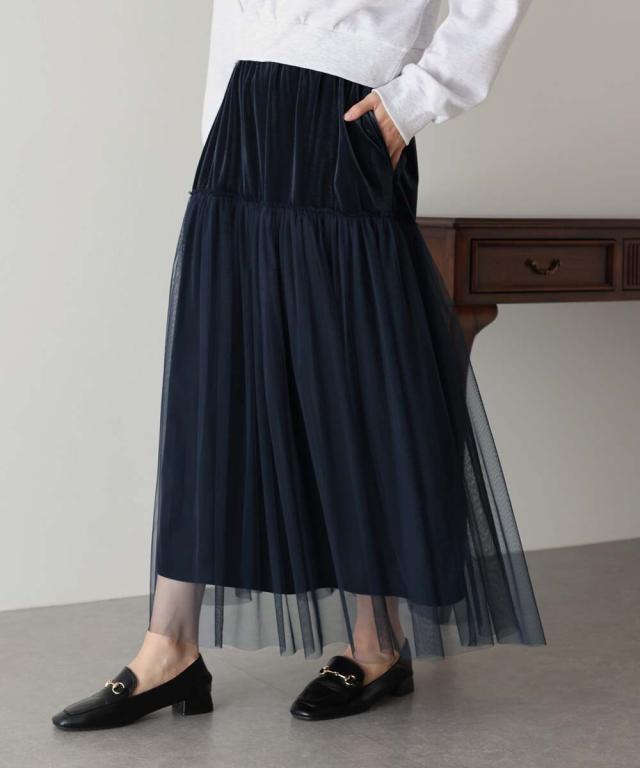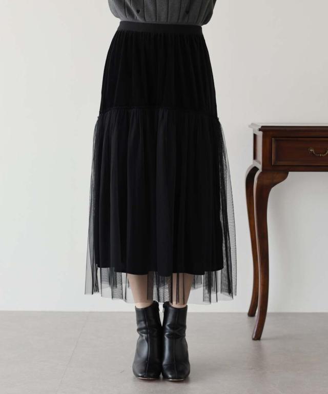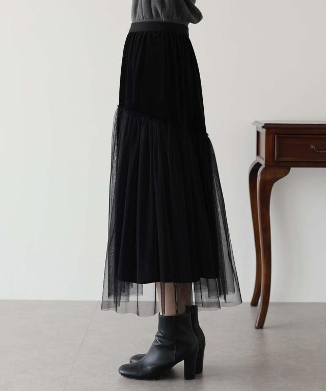 柔らかな光沢とマットな質感が上品なベロア生地にトレンド感のあるチュール素材を重ねたティアードスカート。