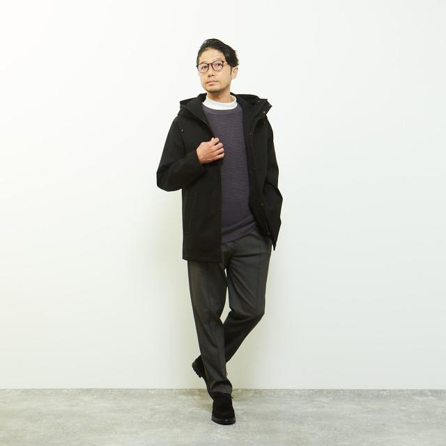 上品な表面感のウーリーなツイル素材をベースに、裏側にボンディング加工を施しました。