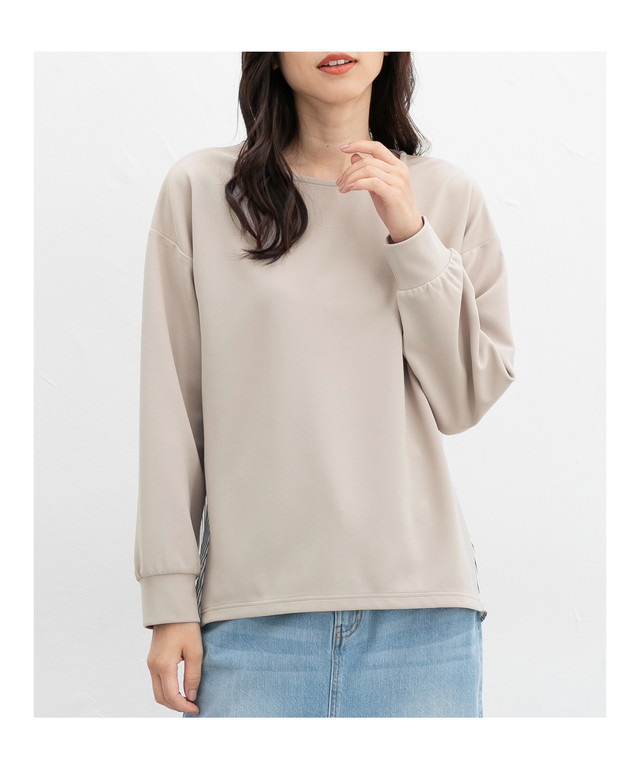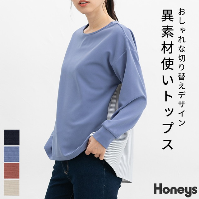 トップス カットソー 長袖 切替 異素材 こなれ感 ストライプ柄 ギャザー レディース SALE セール Honeys ハニーズ 異素材使いトップス