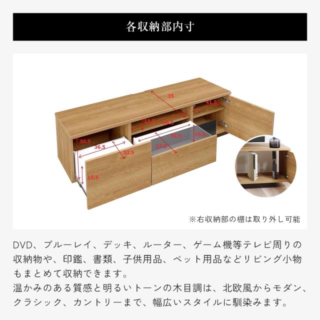 DVD、ブルーレイ、デッキ、ルーター、ゲーム機等テレビ周りの収納物や、印鑑、書類、子供用品、ペット用品などリビング小物もまとめて収納できます。