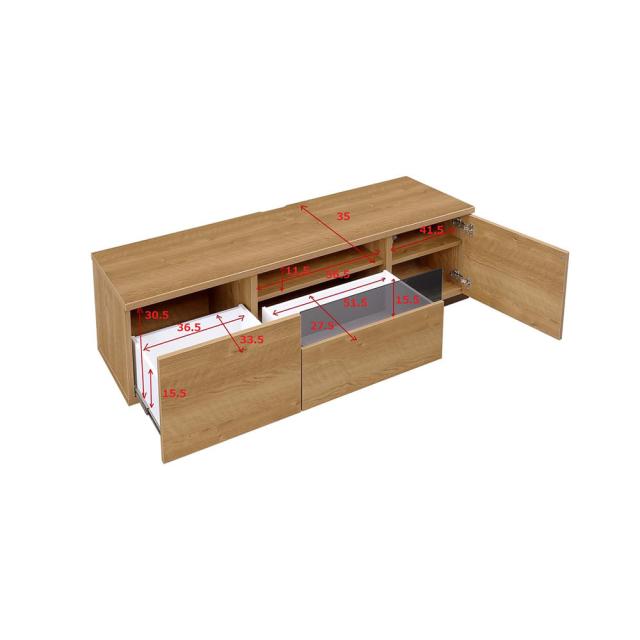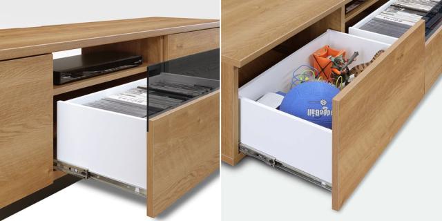 高さ内寸15.5cmの中央引き出しにはDVDやブルーレイディスクなどの小物を収納するのに最適。高さ内寸30.5cmの左引き出しには子供のおもちゃやペット用品など、かさばるものをまとめて収納できます。リビングの整頓が簡単に実現します。
