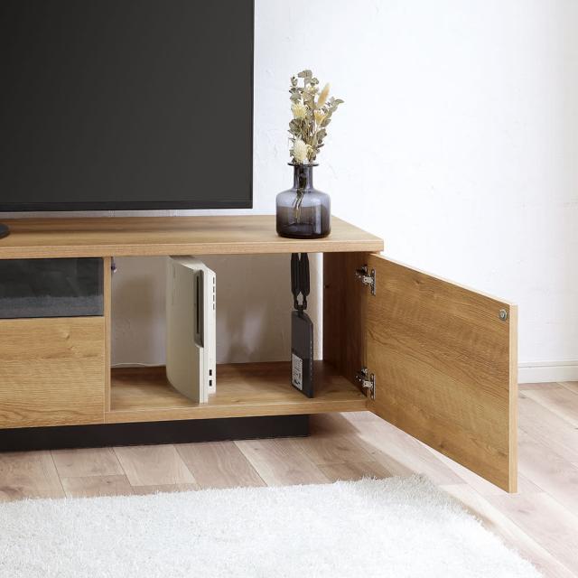 扉付きの右収納部は背面がオープンになっているため熱がこもらず、ゲーム機やルーターなどの電子機器の収納に最適。