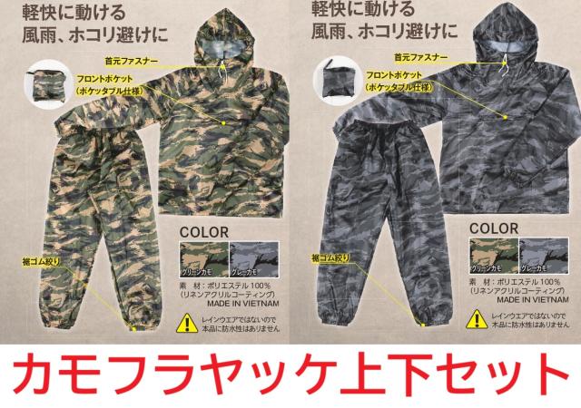 スタンダードなカモフラヤッケの上下ワンセットです