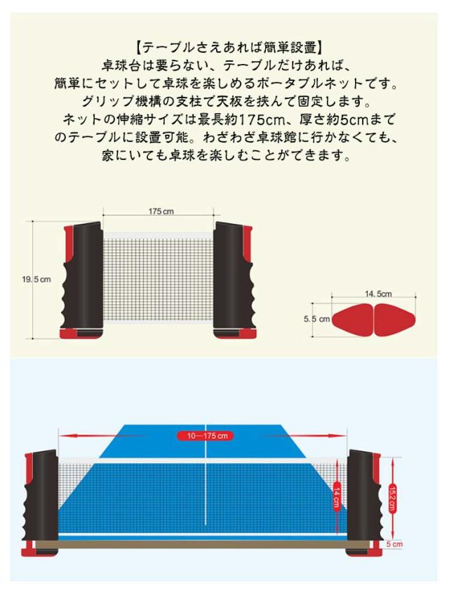 | ラケットx2、ボールx3、ネット、収納袋付き 伸縮卓球ネットセット 4色 【テーブルさえあれば簡単設置】卓球台は要らない、テーブルだけあれば、簡単にセットして卓球を楽しめるポータブルネットです。グリップ機構の支柱で天板を挟んで固定します。ネットの伸縮サイズは最長約175cm、厚さ約5cmまでのテーブルに設置可能。わざわざ卓球館に行かなくても、家にいても卓球を楽しむことができます。 【コンパクト・持ち運びに便利】この卓球セットを使いたい時に使いたいだけネットを引っ張り出す方式で、収納時はとってもコンパクト。自宅、アウトドア、レジャー、職場など、どこでも遊べてすごく盛り上がって楽しめます。卓球は上達するや、運動不足も多少は解消される、ストレス発散にもなる、しかもプラスチック製で軽量なので、旅行やイベントに持っていくのにもおすすめです! 【清潔用スポンジ付き】柔らかいスポンジで、ラケットの表面を傷つけることなく、汚れやほこり、他の粒子を捉えられ、ふんわりなめらかタッチで汚れを拭き取ります。 【ラケット】 材料は木製・ラバー発泡 適度な弾みとソフトな打球感を備える。 【携帯型伸縮ネットラック仕様】卓球セットネットの長さ(横幅)は可変式なので、本格的なプレーを楽しむことも、お子様用に小さな台を作ってあげることも可能です。材質:PEプラスチック、人体工学の応力ハンドル+高度変形防止ネットラック+リバウンドボタンを採用しております。 | |