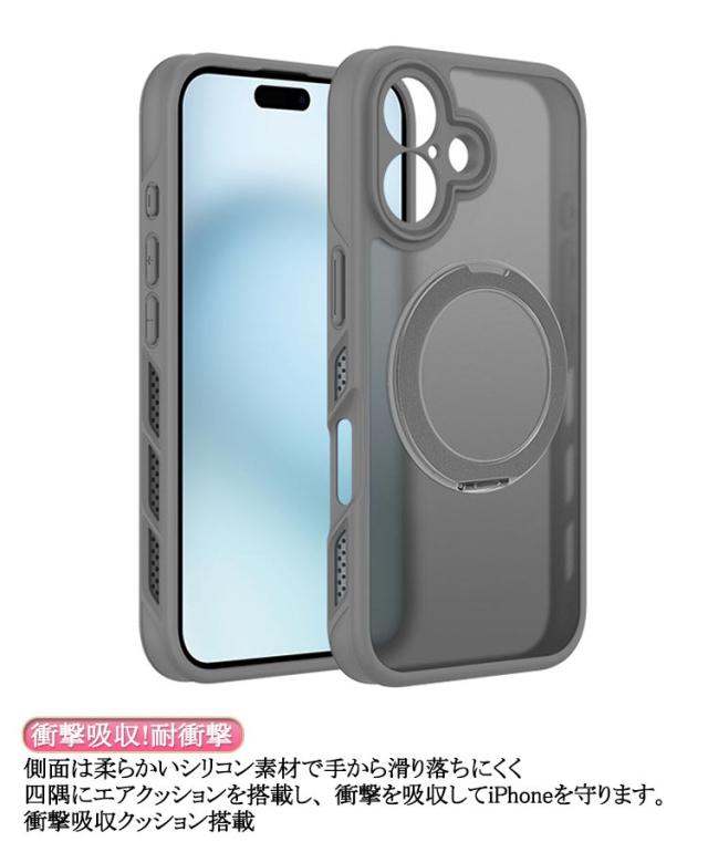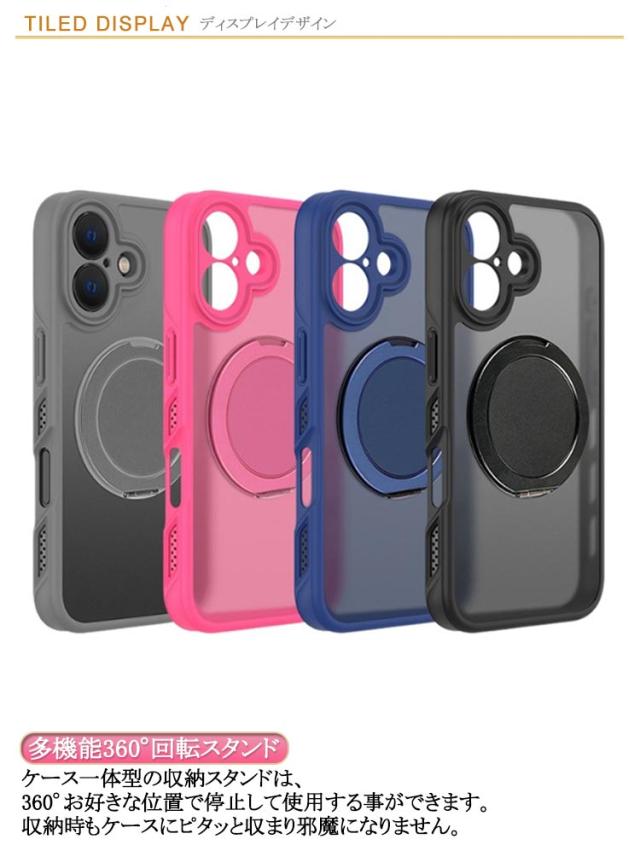 | 【iphone16全シリーズ対応】【多機能360°回転スタンド】【Magsafe対応】 【360°回転式スタンド】 ケース一体型の収納スタンドは、 360°お好きな位置で停止して 使用する事ができます。 収納時もケースにピタッと収まり 邪魔になりません。 【超強力な磁力!Magsafe】 MagSafeの磁力がパワーアップして登場!改良され、より強力な磁気コアを搭載しているのでピタッと装着出来、ズレを心配する事なく安定感抜群! 【衝撃吸収!耐衝撃】 側面は柔らかいシリコン素材で 手から滑り落ちにくく 四隅にエアクッションを搭載し、 衝撃を吸収してiPhoneを守ります。 衝撃吸収クッション搭載 【擦れキズ防止 しっかり保護】 カメラレンズより高くスクリーンより高い 【キレイ長持ち!汚れに強い】 汚れやホコリもつきにくく 握った感触も滑らかで、 背面パネルに汚れがつきにくい。 ケースにピタッと収納されてスタイリッシュに。 | |