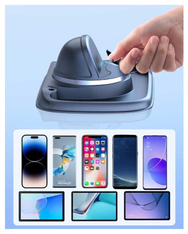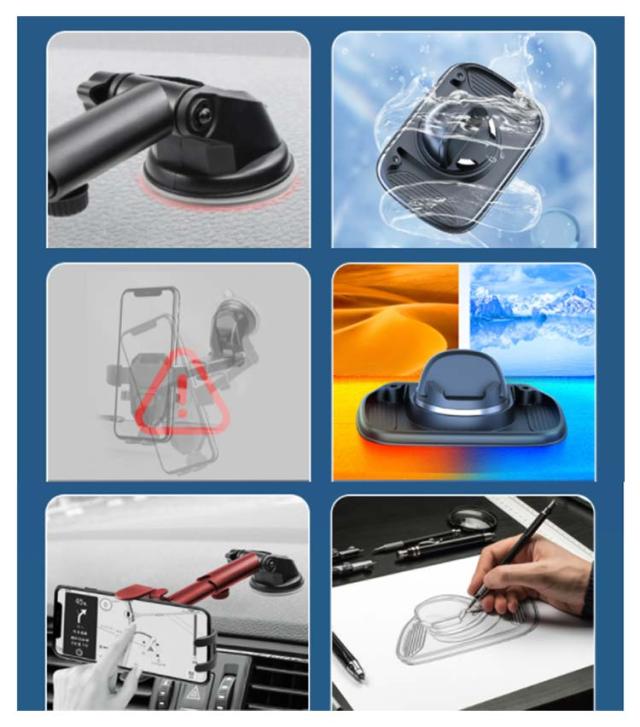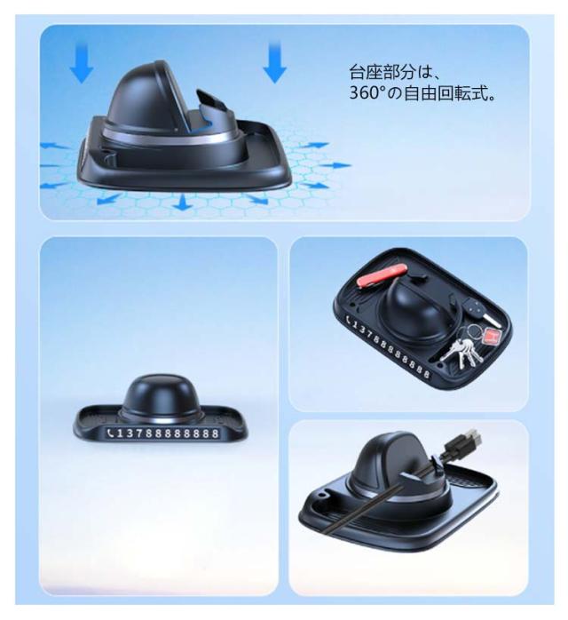 | 安全、安心、確実固定。強力スマホスタンド。 スマホホルダーは超強力粘着パットを採用した上に、スマホを置く部分が滑り止め効果抜群なシリコン素材を利用しています。 ビタッとくっ付き、がっちりスマホをキャッチする。 スマホの取付け取外しも、簡単&確実。 台座部分は、360°の自由回転式。 見やすい位置に、見やすい角度で。 日差しを避け、運転スタイルに合わせた位置調整が可能です。 | |