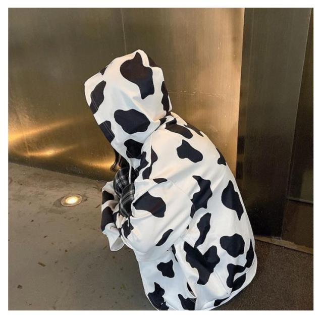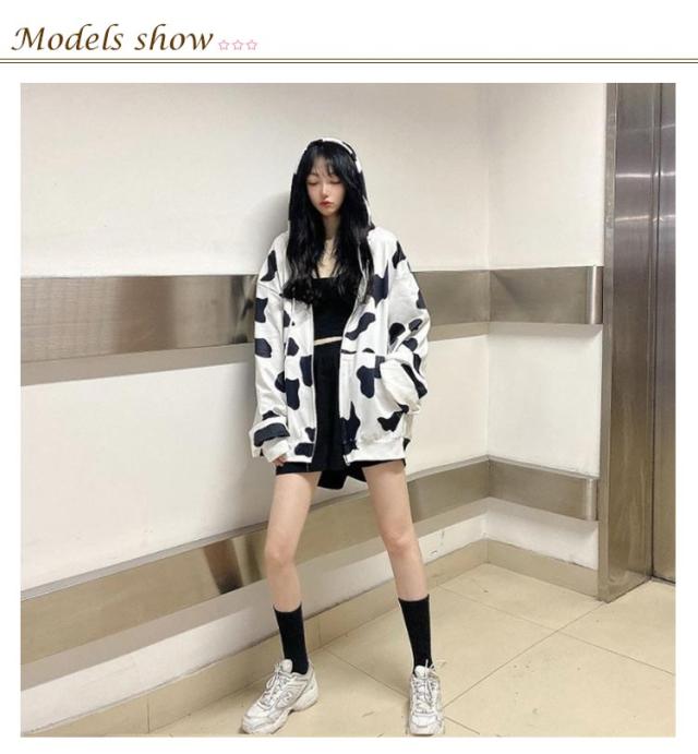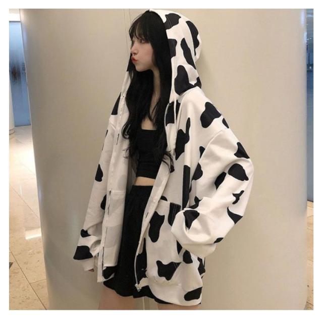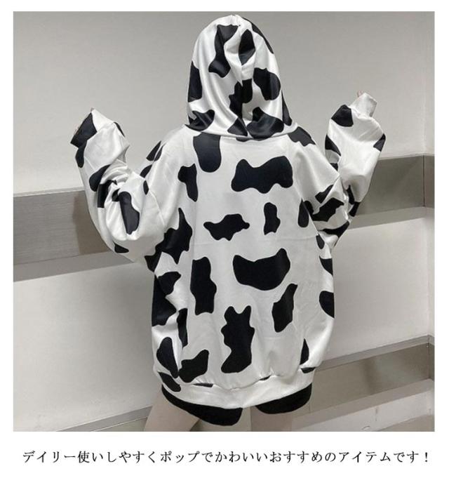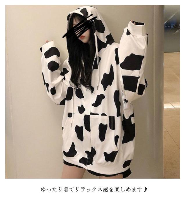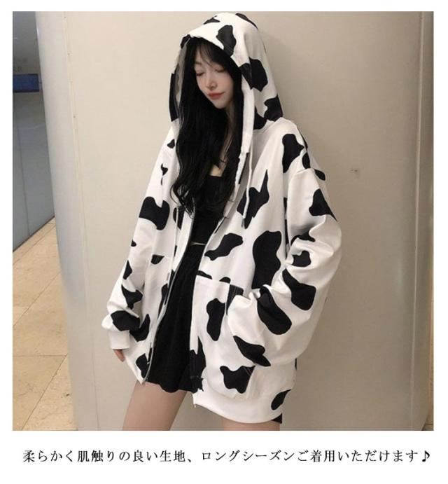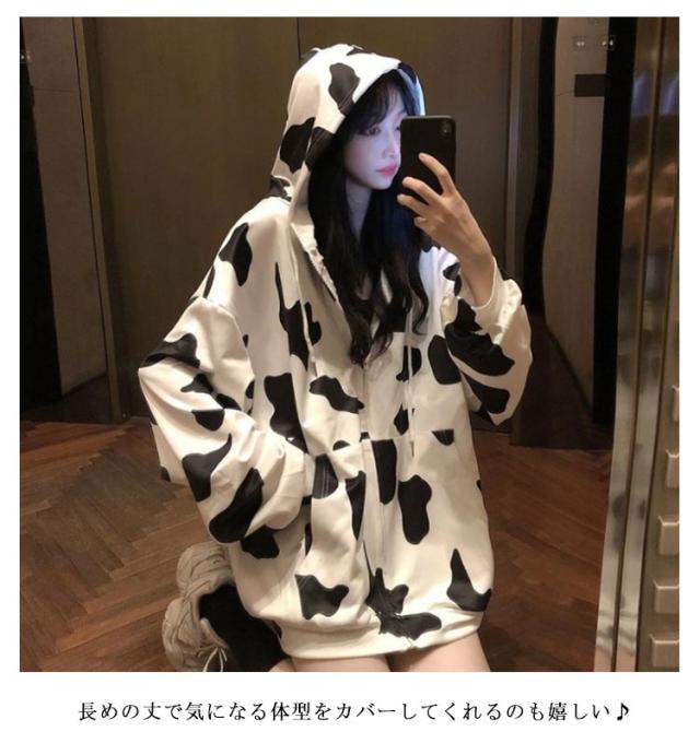 ジップアップ ジップアップ ロング丈 COW柄 パーカー オーバーサイズ パーカー フード付き 長袖 量産型 地雷系 牛柄 原宿風 ストリート系 韓国ファッション 大きいサイズ 個性的