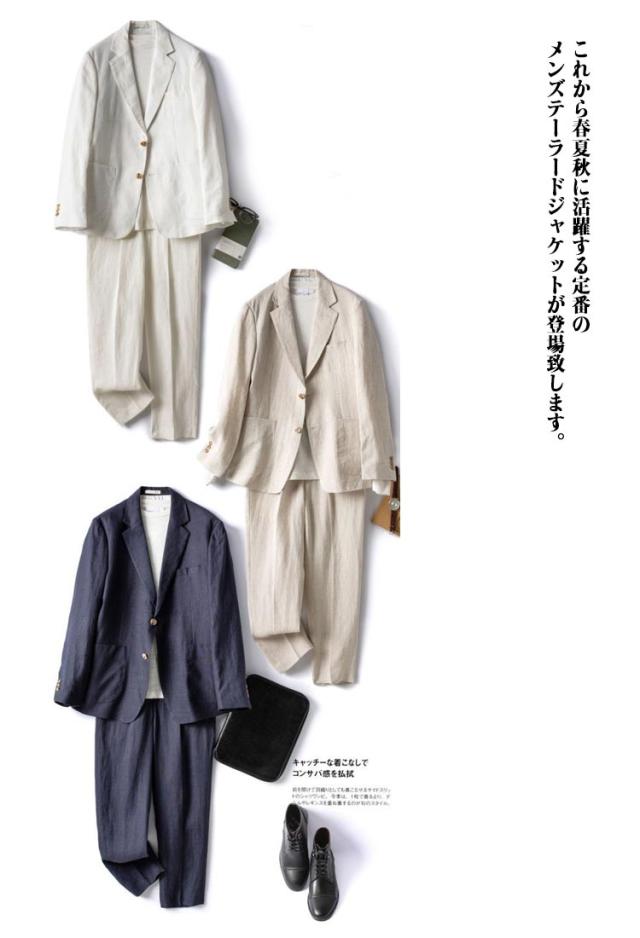 | 軽い素材感で見た目も涼しげなメンズサマージャケットなのでオシャレ度UP! 落ち着いたシンプルなデザインで、ビジネスからカジュアルまでスタイルを選ばずご利用いただける綿麻ジャケットセットです。 これから春夏秋に活躍する定番のメンズテーラードジャケットが登場致します。 素材は通気性抜群のリネン+綿を使用しておりますので、軽くて通気性と吸水性に富んだ。 | |