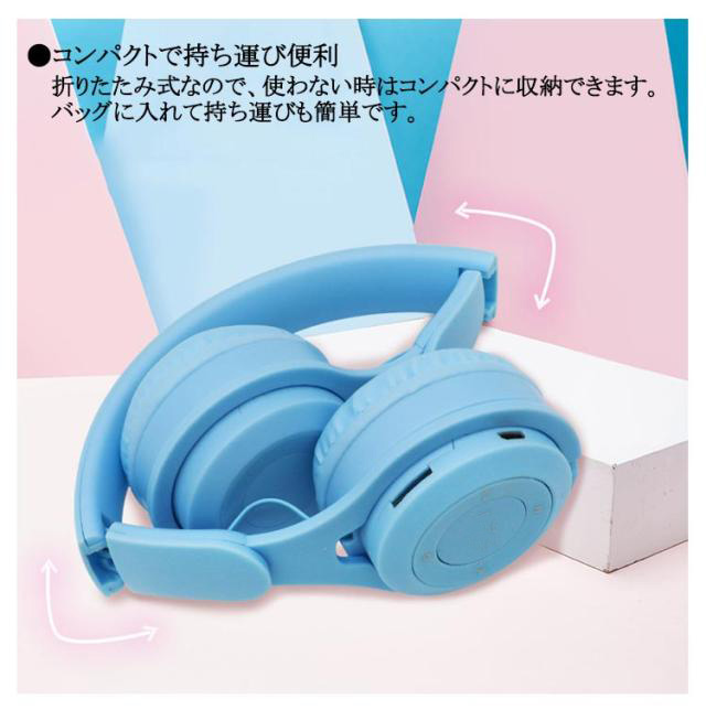 | ●Bluetooth・有線・SDカード再生 ワイヤレスで接続できるBluetooth機能を搭載。ケーブルを使えば有線としても使用可能。子供から大人まで、スマホやタブレット、パソコン、テレビ、ゲーム機など様々なデバイスと簡単に接続できます。 ●密閉型デザイン 外部の音をしっかりと遮断し、高音質な音楽やゲームサウンドを楽しめます。映画やテレビ視聴にも最適です。 ●可愛いデザイン 子供が喜ぶ可愛いデザインで、カラフルなカラーリングやおしゃれな形状が特徴です。持ち運びにも便利な折りたたみ式で、どこへでも持って行けます。 ●軽量で長時間使用可能 軽量設計で、長時間の使用でも疲れにくいです。学校や旅行、家庭での使用に最適です。 ●高音質 迫力あるサウンドを楽しめる40mmの大口径ドライバを搭載しています。音楽やゲームの音質を損なうことなく楽しめます。 ●コンパクトで持ち運び便利 折りたたみ式なので、使わない時はコンパクトに収納できます。バッグに入れて持ち運びも簡単です。 ●長時間バッテリー 一度の充電で長時間使用可能なので、外出先でも安心して利用できます。 | |