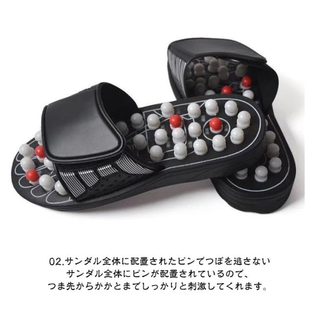 | 超強力な刺激! 健康サンダル 23.0-27.5cm 男女兼用 ■特徴 旋回式の凹凸突起物で足裏を効果的に刺激。 歩くたびに足裏へ気持ちの良い刺激を与え、 身体の血行を改善し、疲れやコリをほぐします。 身体がだるい、疲れがとれない方におすすめです。 <お勧めポイント> ●01.足裏のつぼをジンジンと押す 超強力なピンピンの一つ一つが大きく、硬く、しっかりしているので、足裏のツボをしっかりと刺激します。 ●02.サンダル全体に配置されたピンでつぼを逃さない サンダル全体にピンが配置されているので、つま先からかかとまでしっかりと刺激してくれます。 ●03.まんべんなく足裏を刺激!可動するスプリングのピン ピンはスプリングで回転しながら上下に動きます。だから、足裏全体にまんべんなく刺激が行き届きます。 ●04.外出にも歩きやすい!クッション性に優れた靴底 靴底が厚くしっかりとしているため、外で履いても問題なし!ちょっとした外出時にもおススメ。 ●05.しっかりと刺激を感じられるようマジックテープで足を固定 マジックテープで足を固定できるので、一人ひとりに合うキツさに調節できます。足がしっかりと固定されるので刺激を感じやすいです。 | |
