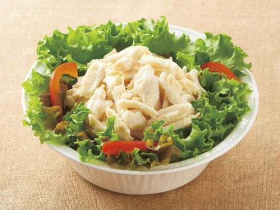 鶏のささみに薄味を付けて蒸し、丹念に手でほぐしました。