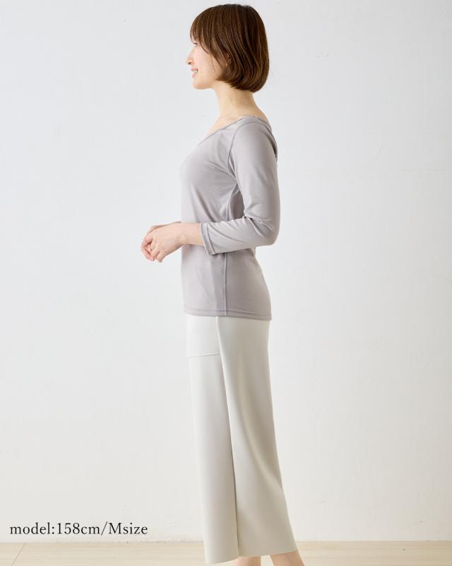 大きく開いたネックラインと手首が細く見える8分袖が、女性らしさを引き立てるバレエネックデザイン。