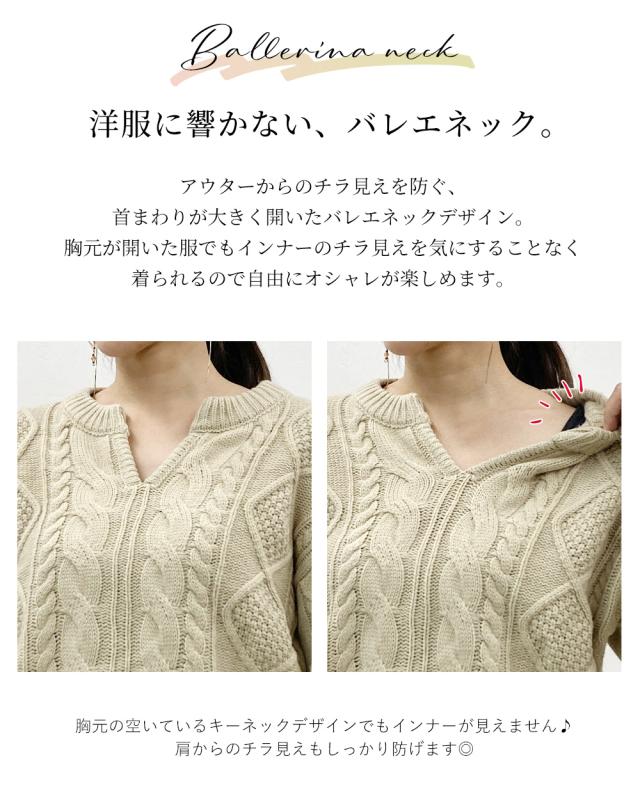 どんなアウターの下でも目立たず、背中が開いたトップスにも最適です。重ね着時のネックラインのもたつきやインナーの見え方を気にせず、オールシーズンのインナーウェアとしても活躍します。