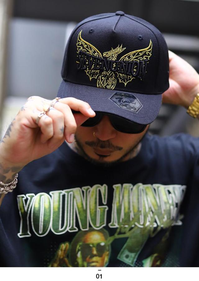 7union キャップ メンズ 春夏秋冬用 黒 大きいサイズ セブンユニオン 帽子 cap 深め カーブバイザー スナップバックキャップ おしゃれ かっこいい 金 ゴールド ドラゴン 竜 龍 刺繍 b系 ヒップホップ ファッション ストリート系 ハイ ブランド 新作 NOVW-103