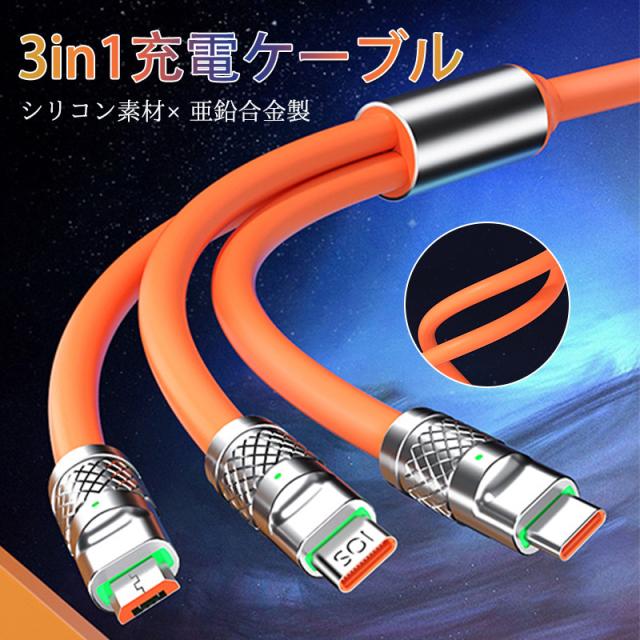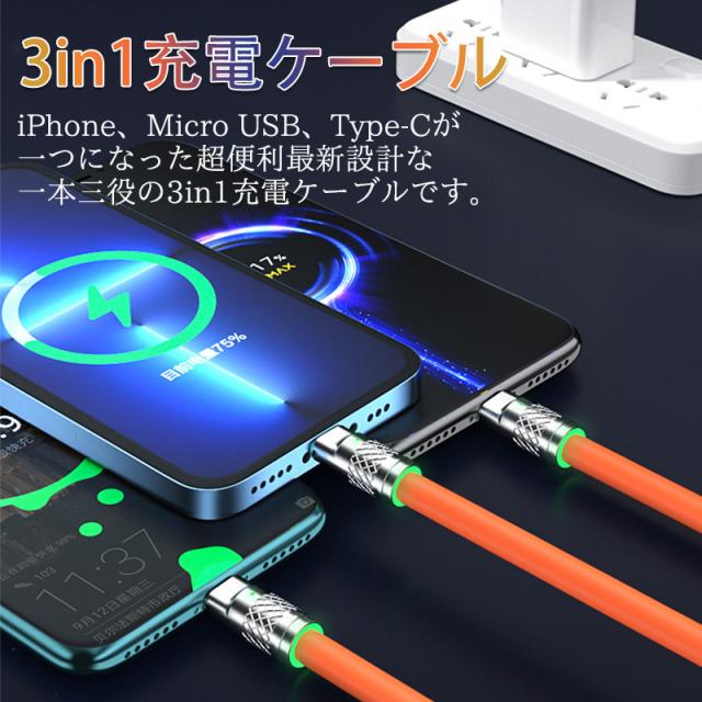 3in1 充電ケーブルです。Phone、Micro USB、Type-Cが一つになった超便利最新設計な一本三役の3in1充電ケーブルです。