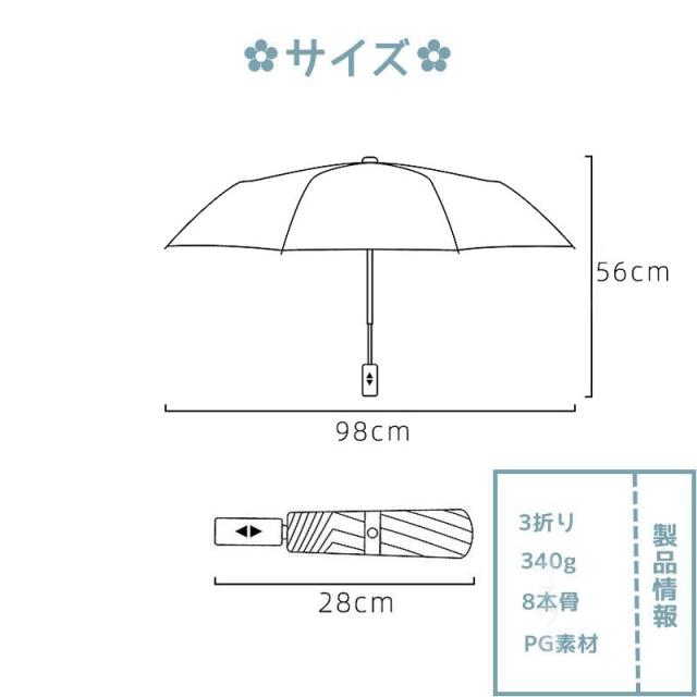 - 思っていたよりも大きく、しっかりしている傘で、自動で開閉するところもとても便利だと思います。これから更に暑くなる季節、通勤にも通勤以外でも外出時にたくさんしようしたいと思います。色も大満足です。