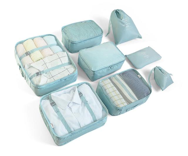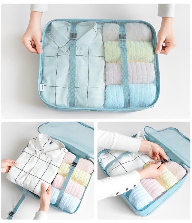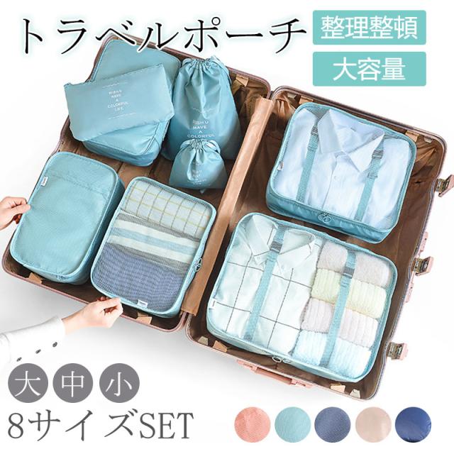 - 旅行に間に合いました。8点セットの大と中は、中にベルトが有り、服を留められて型崩れしなくて良いですねぇ〜化粧品やお風呂セットも持って行き、少し位の濡れは大丈夫ですょ〜 携帯の充電器や小物も小分け出来て、買って良かったですょ〜最高ですねぇ〜又、出掛けたいですねぇ〜