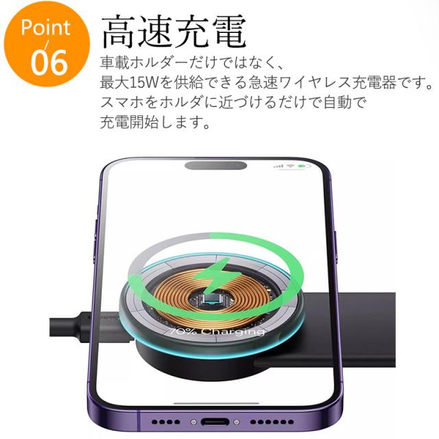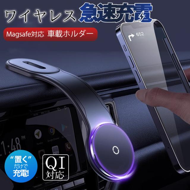 車載ホルダー ワイヤレス充電器 急速充電 車載充電器 携帯充電器 最大15W出力 Magsafe スマホスタンド スマホホルダー マグネット 車載 片手操作