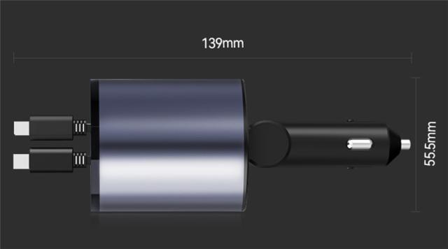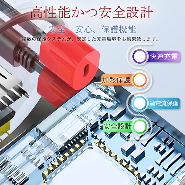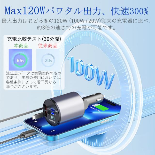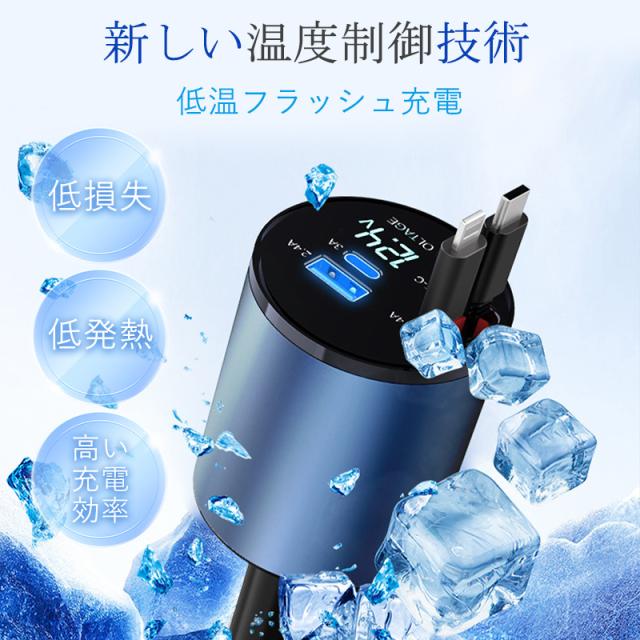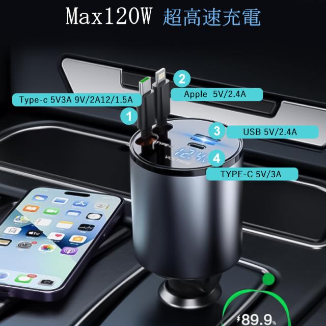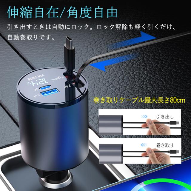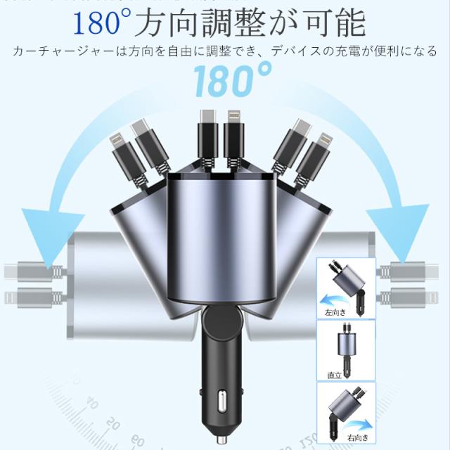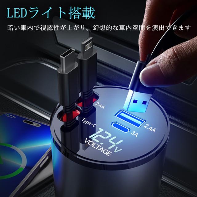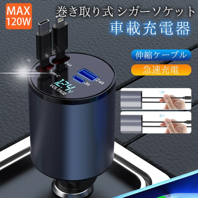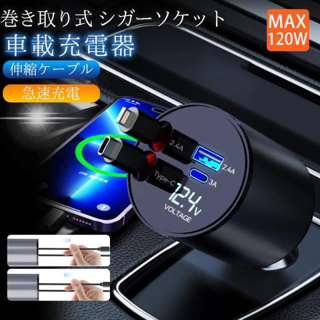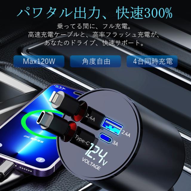 シガーソケット カーチャージャー 巻き取り 充電器 急速充電 4in1 USB Type-C Lightning スマホ充電器 車用充電器
