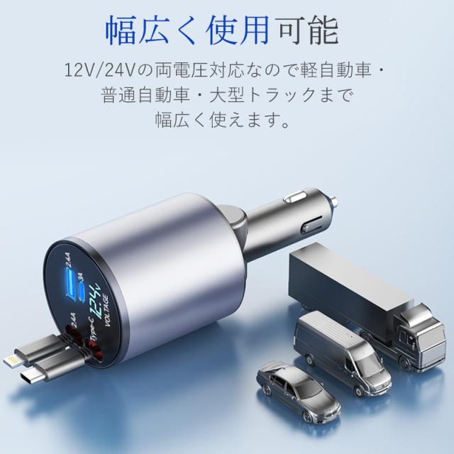 シガーソケット カーチャージャー 車 充電器 巻き取り 車 車載充電器 巻き取り式 ケーブル 4ポート USB iPhone Android Type-C Lightning 4台同時に充電 スマホ スマートフォン スマート充電 USB-C Galaxy S22 S21 iPad PD iPhone 15 14 13 12 巻き取り式 12V車 24V車 シガーチャージャー USBポート付 リールタイプ 後部座席 電圧計