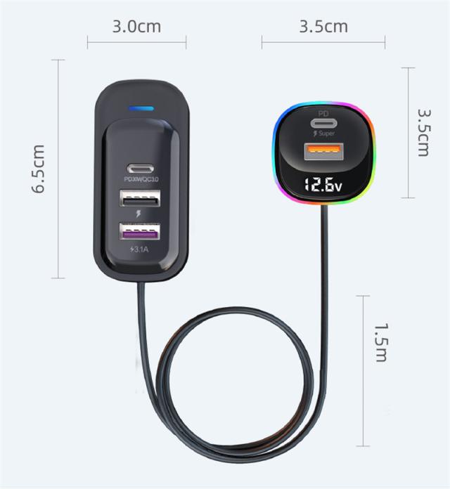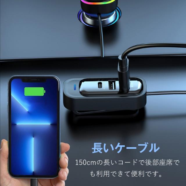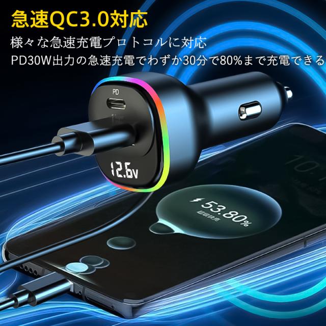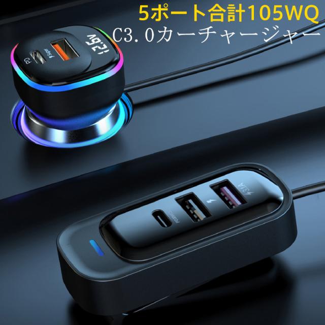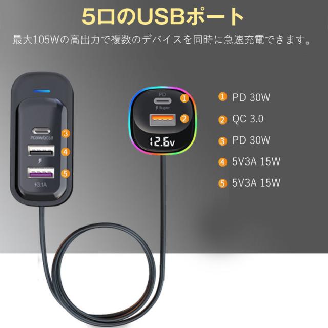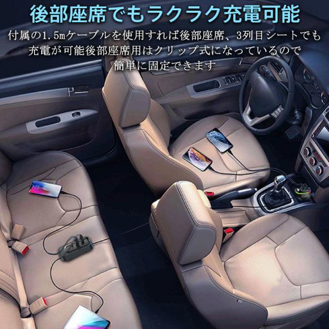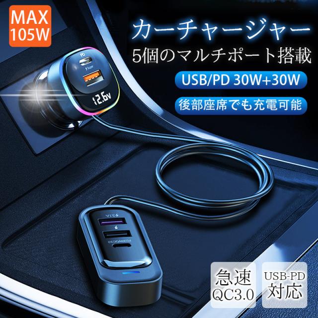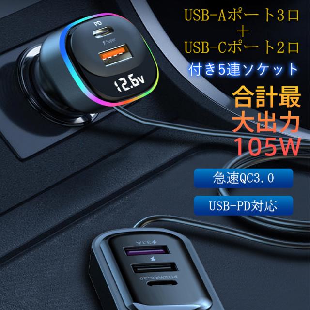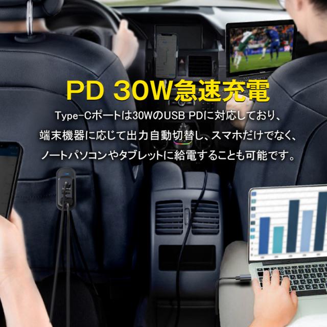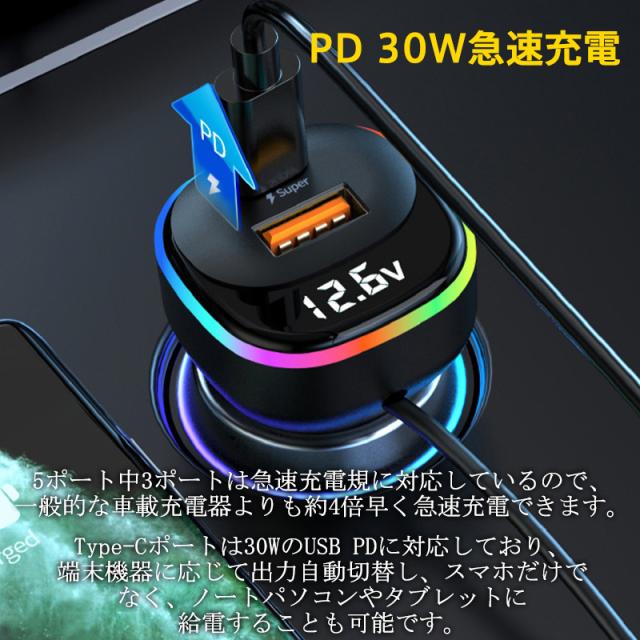 シガーソケット カーチャージャー 充電器 増設 PD 30W QC3.0 5ポート iPhone 急速充電 後部座席 スマホ充電器 車用充電器