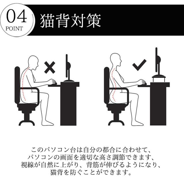 パソコン作業時の理想的な姿勢は、パソコンデスクに座ったとき、モニターが水平視線よりも下に来る高さです。