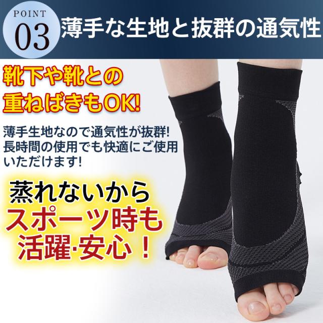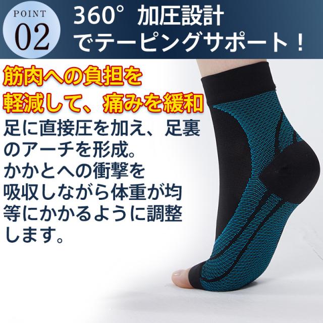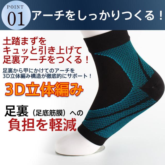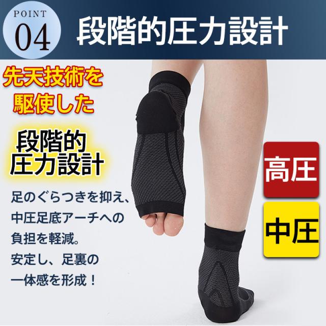 足回りを強力に引き締め、足首や足底筋膜炎の痛みを軽減、扁平足を予防する効果が期待できるサポーターです。