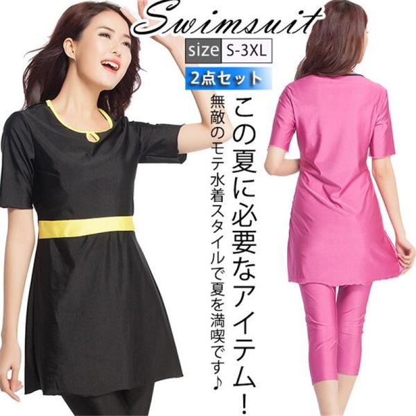 水着 レディース 2点セット 水着セット フィットネス水着 練習用 半袖 七分丈 ショートバンツ リゾート 体型カバー 大きい ママ水着