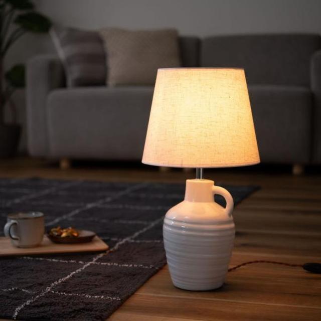 ●ありそうで無かった「陶器+ファブリック」の組合わせがお洒落なテーブルライト。●デスク上ではもちろん、ソファサイド・ベッドサイド等いろいろな場所で活躍。●シェードは角度を調整する事が出来るので、間接照明としてだけでなく、補助灯としても使えます。●読書タイムの空間を落ち着かせてくれるだけでなく眼にも優しいので、おやすみ前のリラックスタイムにもぴったり。●リラックスタイムが終わったら、手元のスイッチですぐに消灯できます。●テーブルライトは夜間だけでなく、日中のインテリアにも最適。ちょっと物足りなかった空間も、置くだけでグレードアップ。●テーブルライトをお部屋に取り入れて日々の生活をワンラックUP。