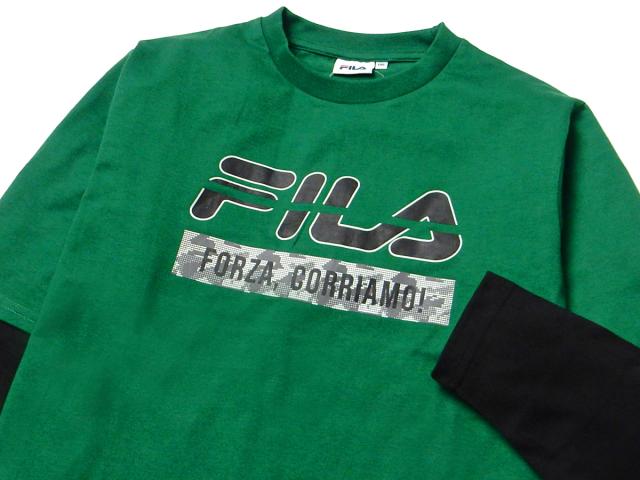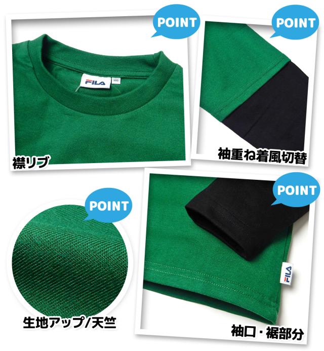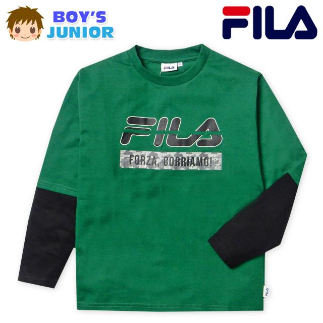 【送料無料】男児 ジュニア 重ね着風 長袖 Tシャツ FILA/フィラ 天竺 袖レイヤード風切替 ロゴプリント 子供服 男の子 140cm 150cm 160cm iw-1155b-gn【メール便対応】