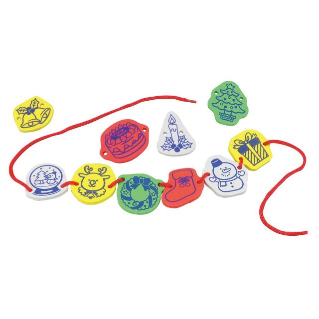 クリスマス柄のひもとおし! 長さを調節して首かざりにもできる!20ピース、ひも3本付