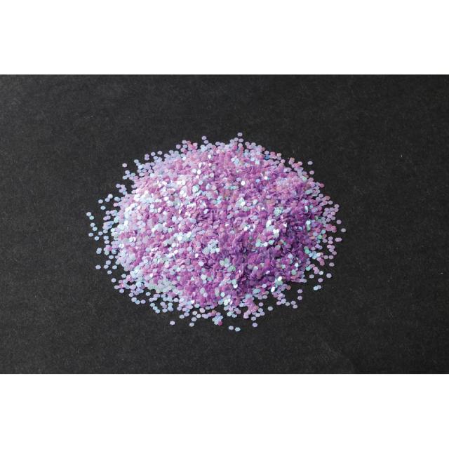 約1mmの六角形の形をしたオーロララメ粉グリッターです。ネイルに使ったり、レジンやスライムなどに封入すると、キラキラ輝きます。