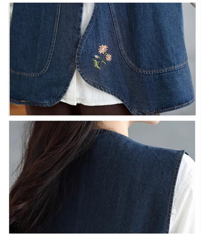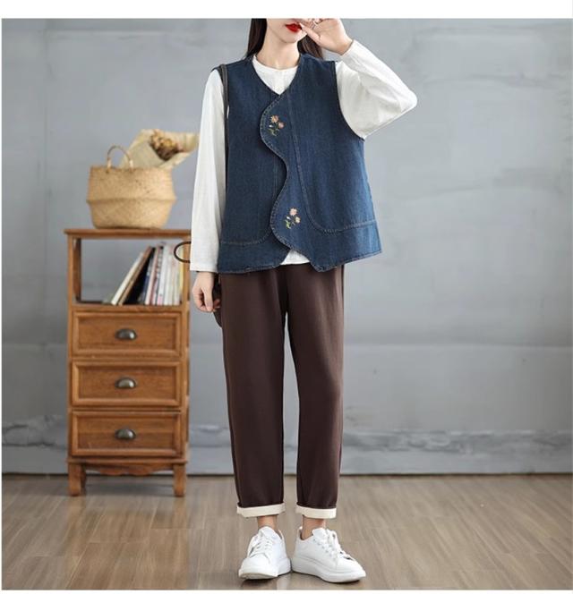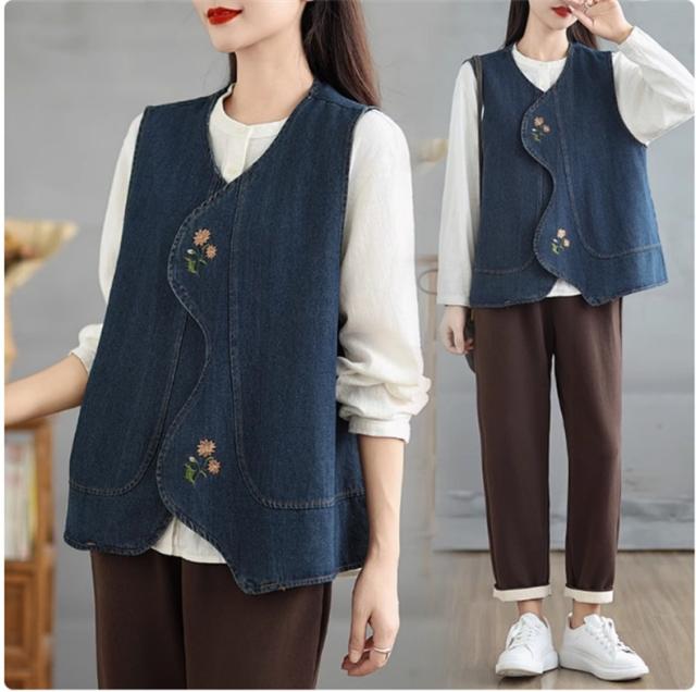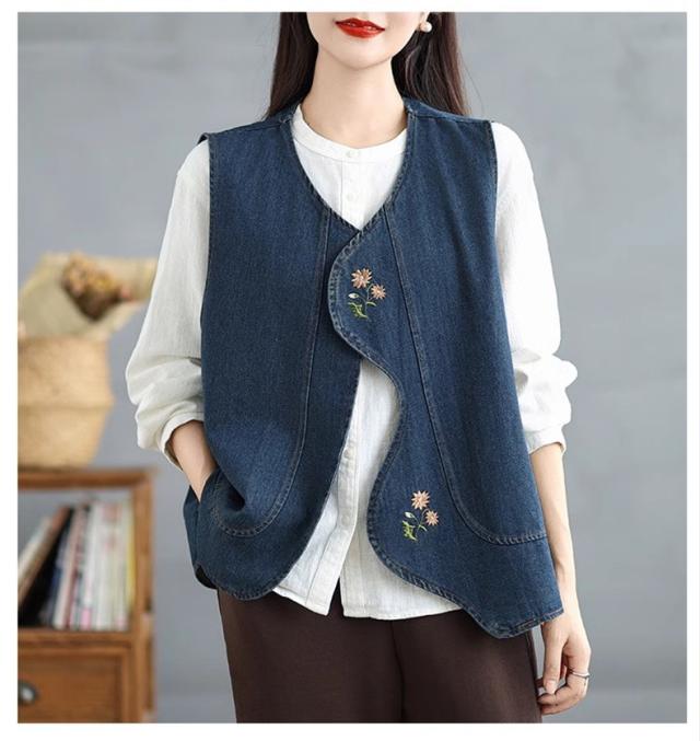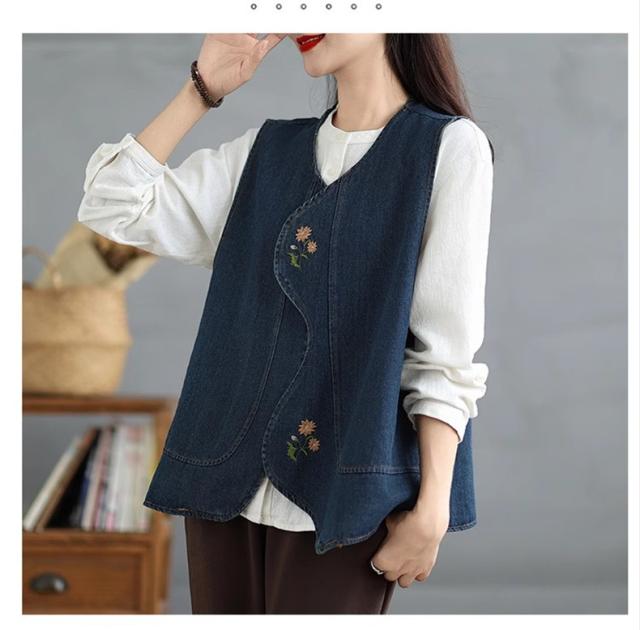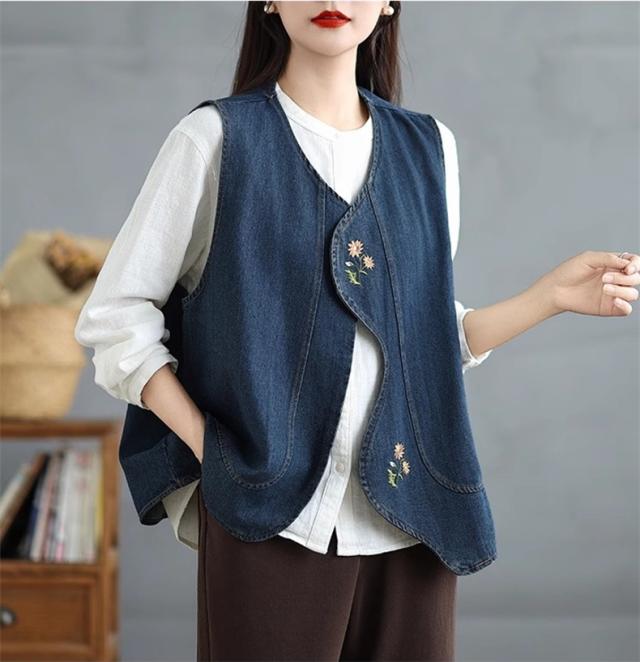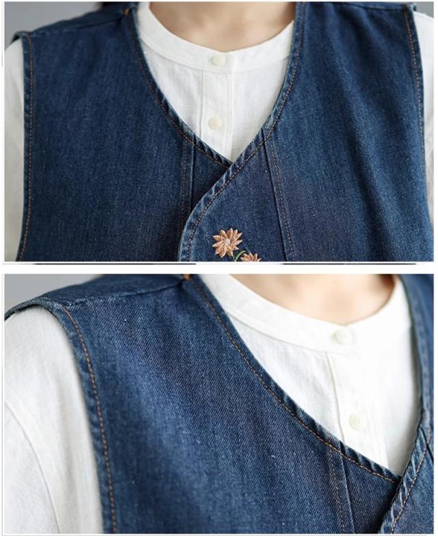 デニムベスト レディース トップス 春秋 綿 体型カバー ゆったり 刺繍 デートやイベントなどにもおすすめ 大人カジュアルと女性らしさを兼ね備えた1枚