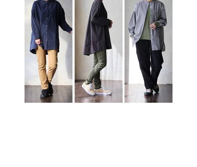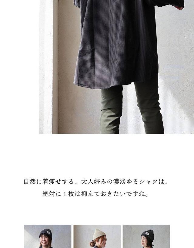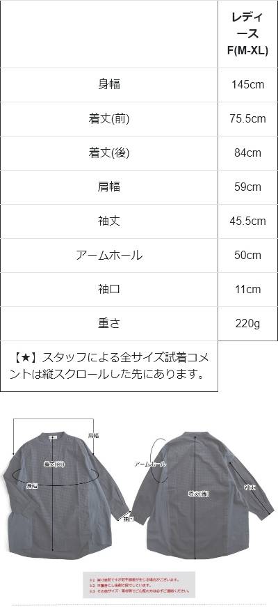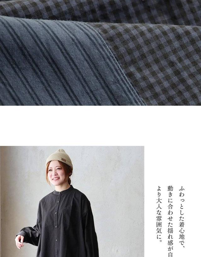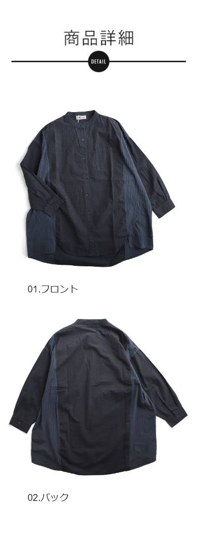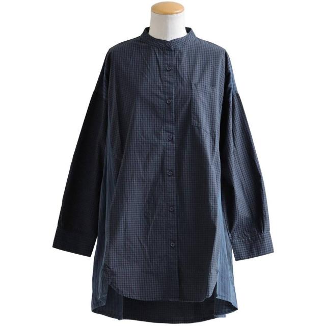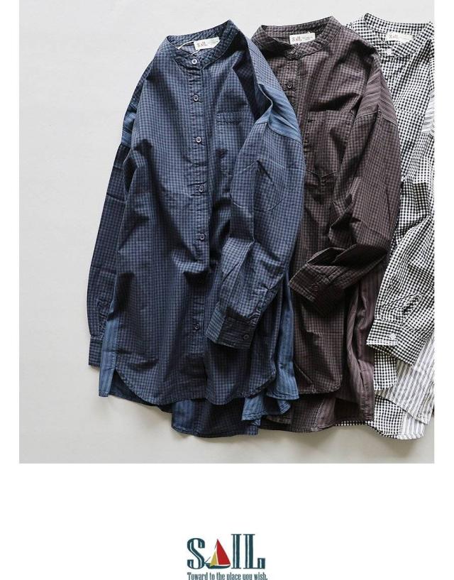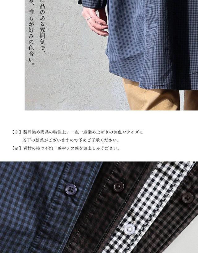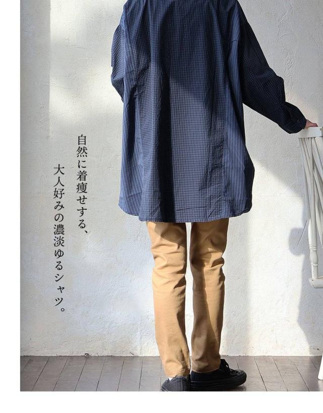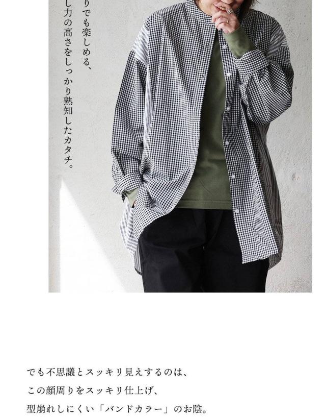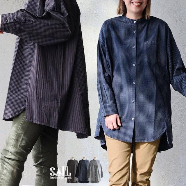 【メール便50】 シャツ レディース ワイド すっきり 着痩せ 長袖 しっかり 丈夫 薄手 綿100 コットン ロング丈 バンドカラー お尻 体系 カバー ドロップショルダー 色合い ギンガム ストライプ 切り替え 大きめ 大きいサイズ カジュアル パティ SAIL セイル