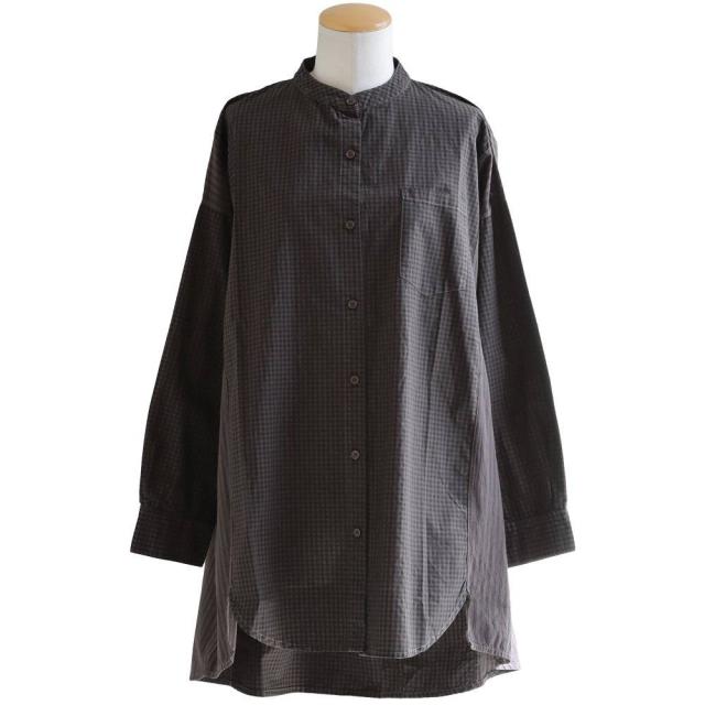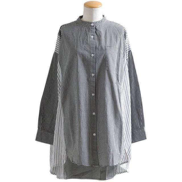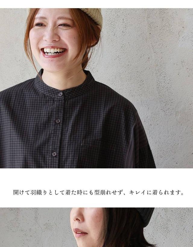 シャツ レディース ワイド すっきり 着痩せ 長袖 しっかり 丈夫 薄手 綿100 コットン ロング丈 バンドカラー お尻 体系 カバー ドロップショルダー 色合い ギンガム ストライプ 切り替え 大きめ 大きいサイズ カジュアル パティ