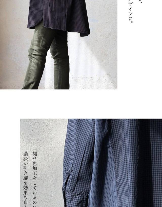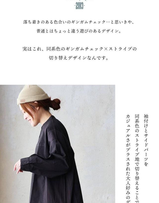 ・同系色の小ギンガム×ストライプの切り替えデザイン。