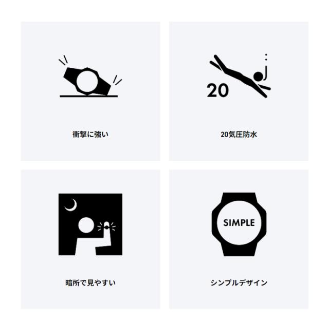 ・ストップウオッチ(1/100秒(0’00’’00〜59’59’’99)、1秒(1:00’00’’〜23:59’59’’)、24時間計)、スプリット付き)
