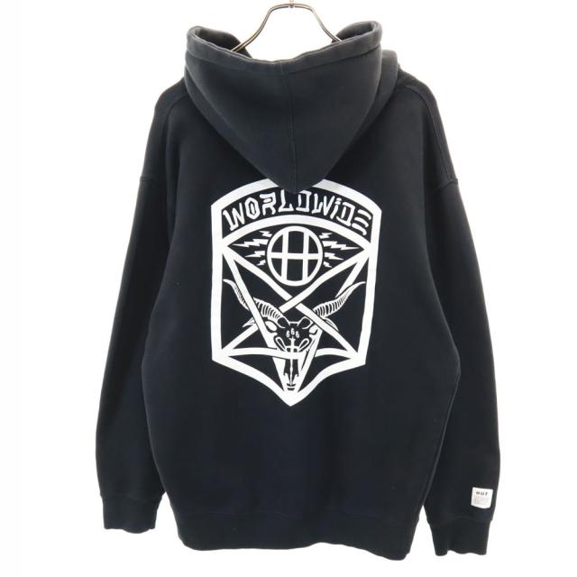 ハフ × スラッシャー コラボ バックプリント 長袖 スウェットパーカー M ブラック HUF × THRASHER 裏起毛 プルオーバー メンズ