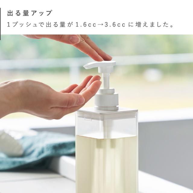ポンプ位置を奥にすることで当社従来品よりも滑り落ちを改善。1プッシュで出る量も1.6cc→3.6ccにアップしました。