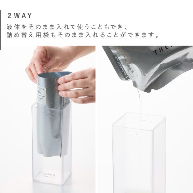 液体をそのまま入れて使うこともでき、詰め替え用袋もそのまま入る便利な2WAY。蓋が大きく外れるので詰め替えもラクラクです。