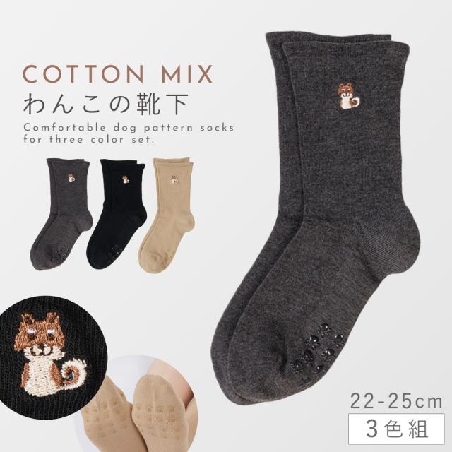 履き口 ゆったり 靴下 レディース 3色組 22-25cm 滑り止め 犬 柄 おしゃれ ゆるめ 締め付けない ゆったりワンちゃん刺繍ソックス(すべり止め付)