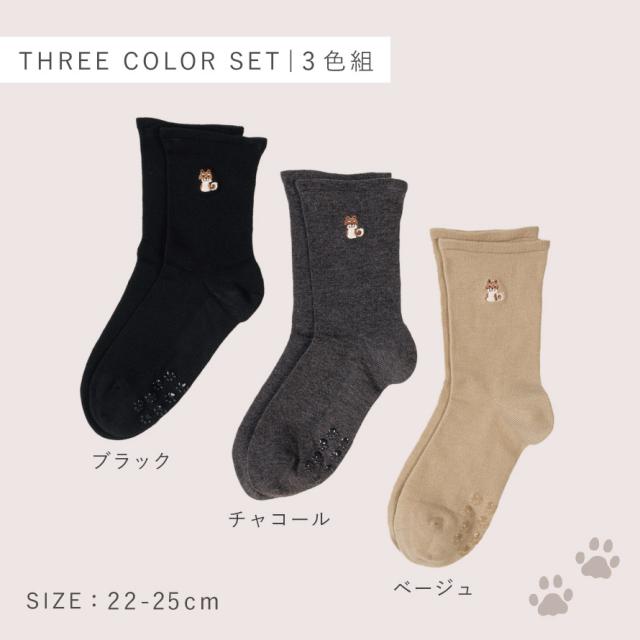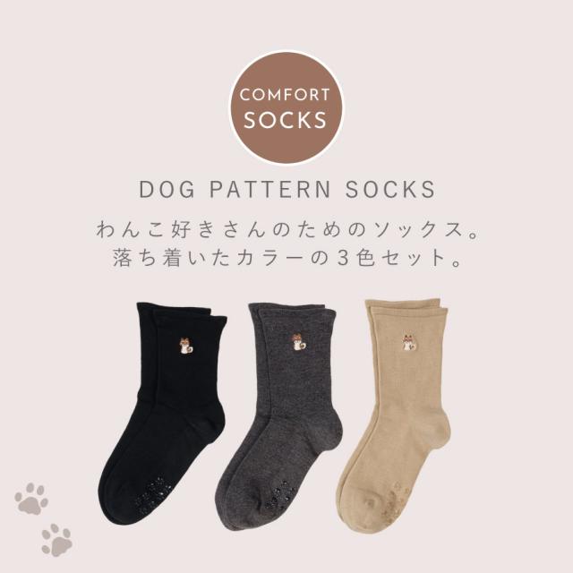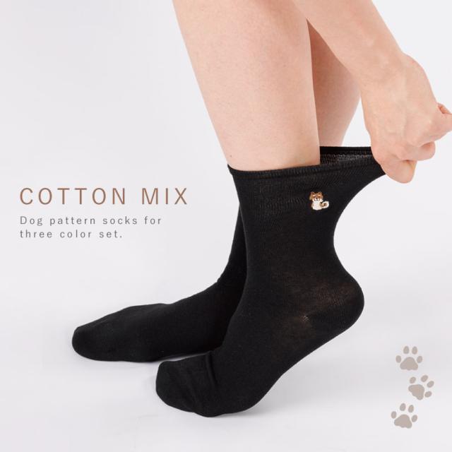 わんこの刺繍入。口ゴムゆったり、滑り止め付で安心のソックス3色セット。サイドのワンちゃん刺繍がポイントのソックス。落ち着いたカラーでどんなスタイルにも合わせやすく◎。